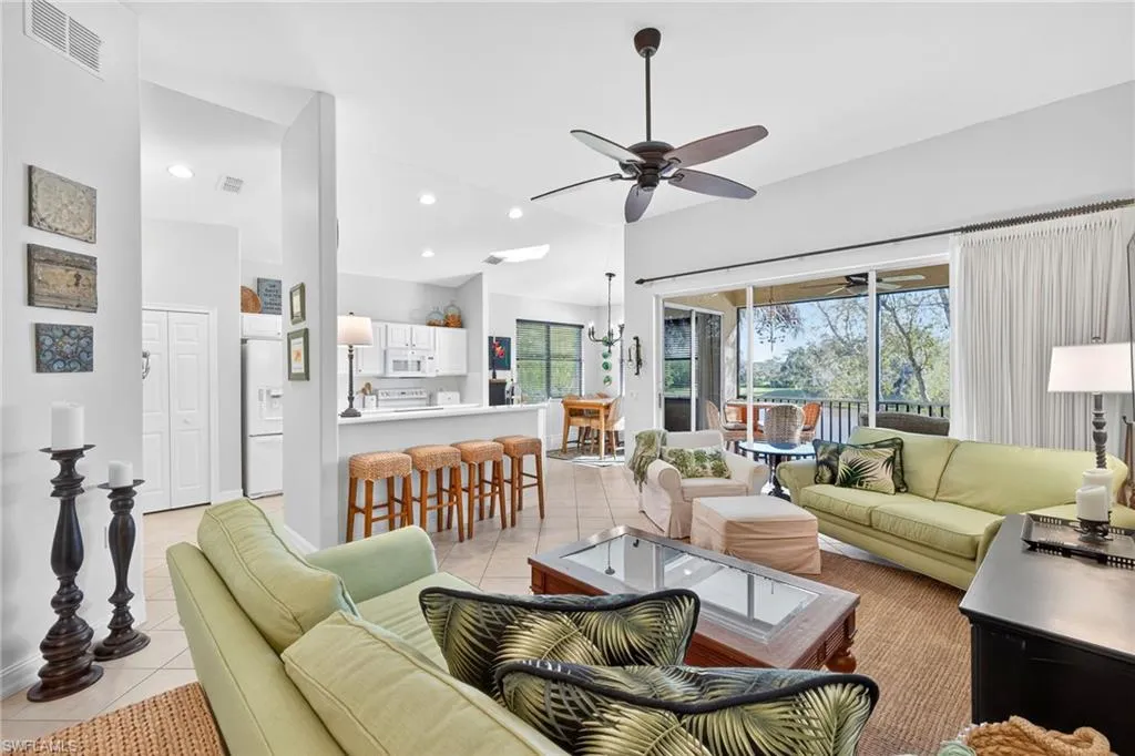Bright & Spacious Lakeview Home with Desirable Open Floor Plan! Step into this beautiful residence featuring an open kitchen and great room layout, with chic contemporary decor and furniture. Perfect for entertaining and everyday living! Enjoy tile flooring in the main living areas and newer carpet in the bedrooms for comfort and style. The eat-in kitchen boasts a breakfast bar and flows seamlessly into the vaulted-ceiling living space, filled with natural light from its eastern exposure. The primary suite offers a tranquil retreat with a tray ceiling, private lanai access, and a custom walk-in closet system. The en-suite bath includes dual sinks and a sleek frameless glass shower. Guests will appreciate the privacy of a separate bedroom and bath, while the spacious den—complete with laminate wood flooring, a pull-out couch, and plantation shutters—adds versatility for work or relaxation. Unwind on the screened lanai overlooking the serene lake, and enjoy modern conveniences like a tankless hot water heater and a laundry room with cabinetry and newer washer/dryer. This home combines comfort, functionality, and scenic charm, and is being offered turnkey furnished. Just unpack and enjoy the resort life! If you are looking for an active lifestyle look no further: 27 holes of Championship golf, 14 pickleball, 8 tennis and 6 bocce courts. State of the art fitness center that is professionally staffed. Pelican Sound is nestled up to the Estero River with access to the Gulf. The community offers dry boat storage, kayaks, canoes and paddle boarding, along with a shuttle boat to Lovers Key State Beach Park. Minutes from RSW International airport and surrounded by fabulous shopping and restaurants. Start Living The Dream!