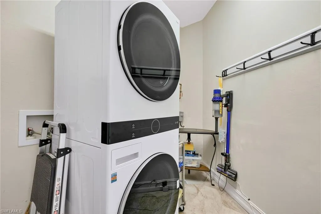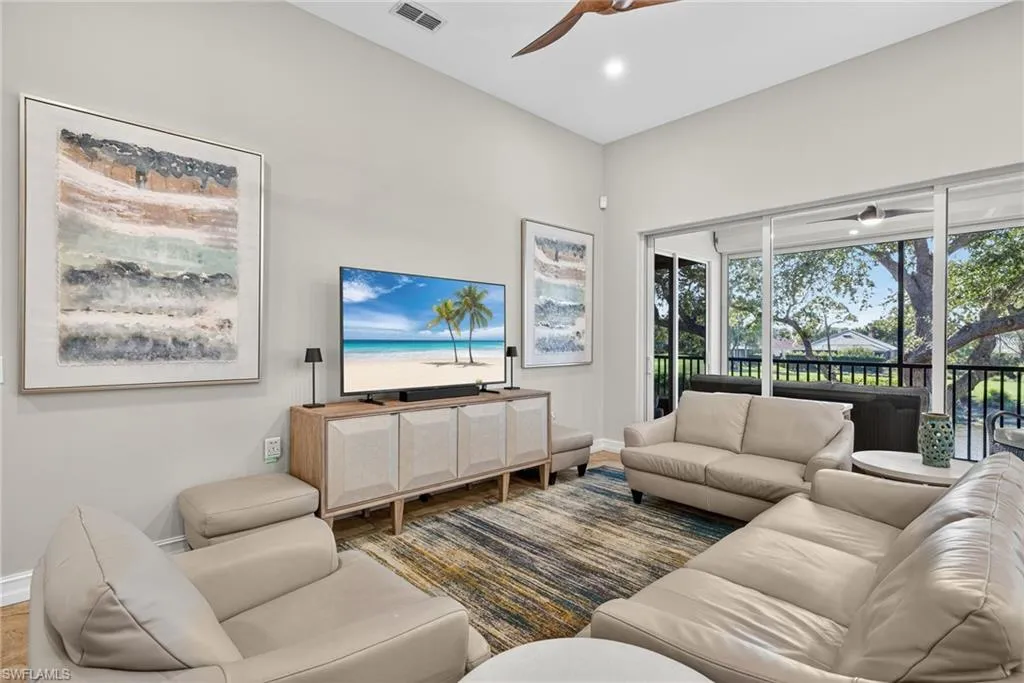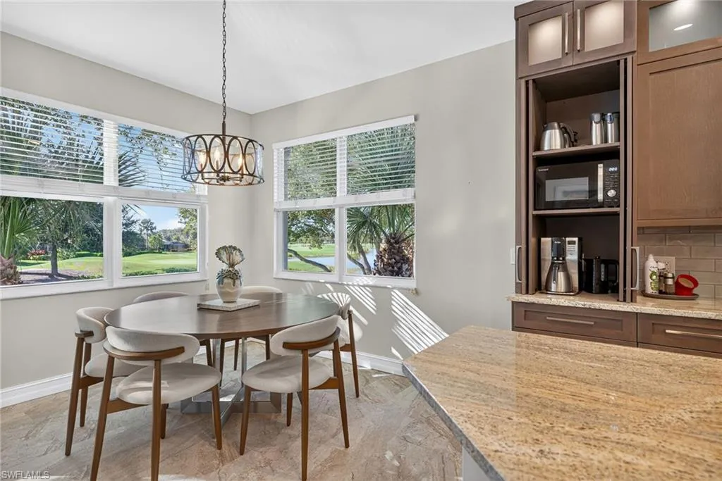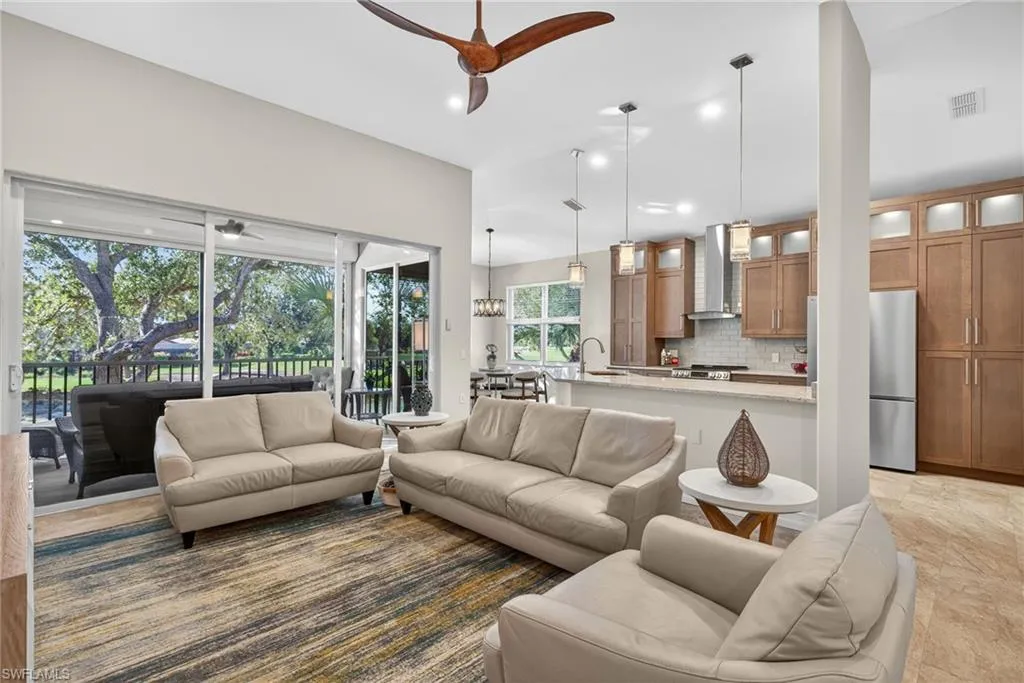 Step into this meticulously updated end unit coach home in Pelican Sound, Southwest Florida’s premier bundled golf community. Beautifully updated and tastefully decorated, featuring ceramic tile in the living areas and stairs, and luxury vinyl flooring in both the primary and guest bedroom. The spacious living room boasts a built-in bar with wine cooler, recessed lighting, and elegant pocket doors—perfect for entertaining. The updated kitchen shines with brand new LG stainless steel appliances, granite countertops, gorgeous rich gray cabinetry, a pantry with pull-out shelves, designer lighting, and is completely open to the living area. The primary suite offers a tray ceiling, lanai access, and a luxurious bath with a seamless glass shower door, dual sinks with pull-out shelves below, and touch-light mirrors. The guest bedroom is adjacent to the guest bath, and offers privacy for visiting family and friends. The den/flex room offers a pull out couch for extra sleeping space when needed. The tiled lanai is a relaxing retreat, with wonderful lake and golf course views through the new “noseeum” screens. Additional upgrades include electric hurricane shutters on the lanai, new impact windows and sliders, a 2022 LG washer and dryer, a 2024 tankless water heater, a 2022 A/C system, and a 2023 roof. This home combines style, comfort, and peace of mind— plus an attached one car garage, perfect for your golf cart! If you are looking for an active lifestyle look no further: 27 holes of Championship golf, 14 pickleball, 8 tennis and 6 bocce courts. State of the art fitness center that is professionally staffed. Pelican Sound is nestled up to the Estero River with access to the Gulf. The community offers dry boat storage, kayaks, canoes and paddle boarding, along with a shuttle boat to Lovers Key State Beach Park. Minutes from RSW International airport and surrounded by fabulous shopping and restaurants. Start Living The Dream!