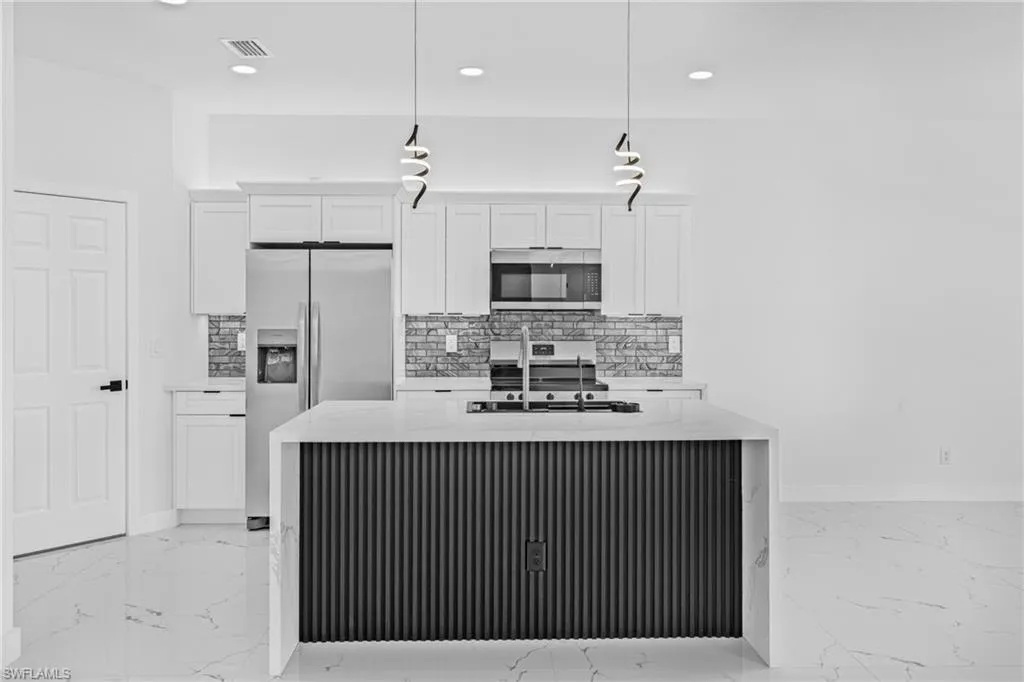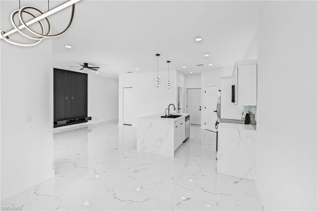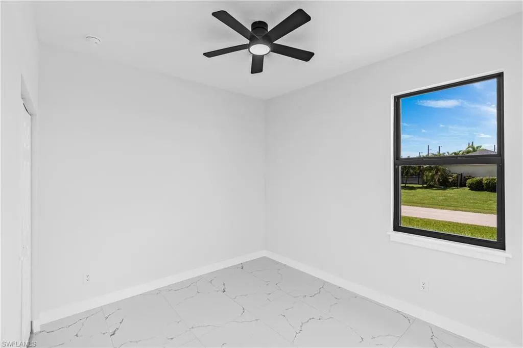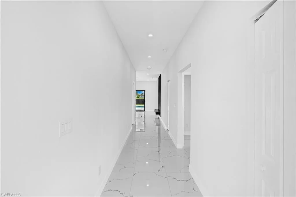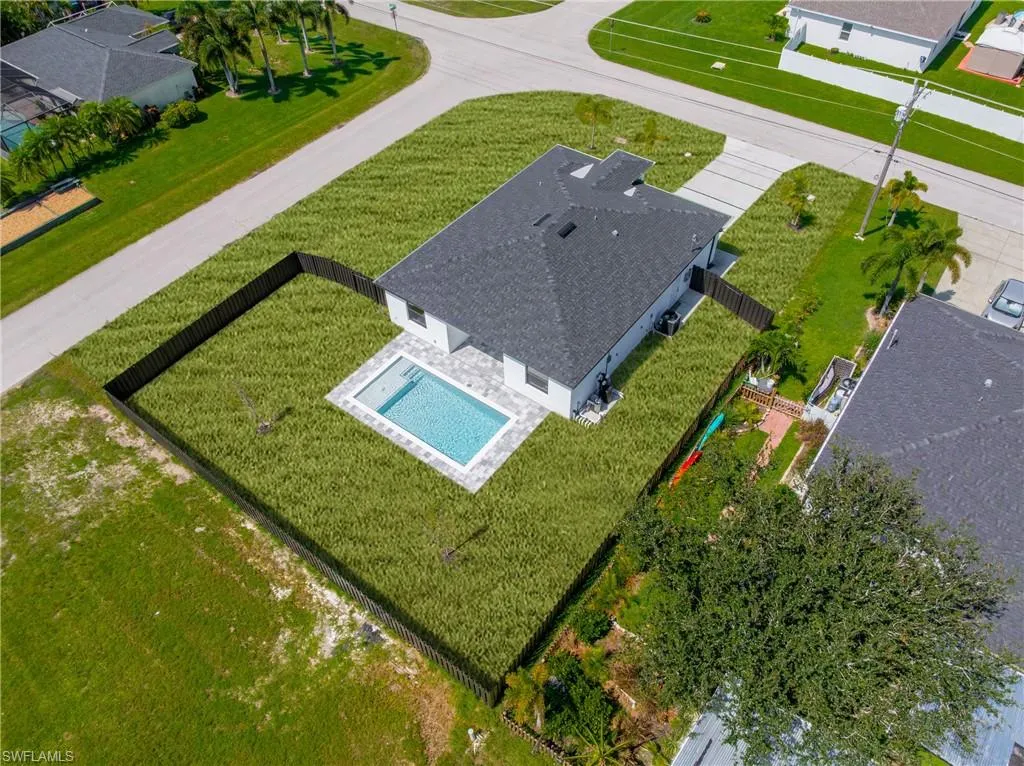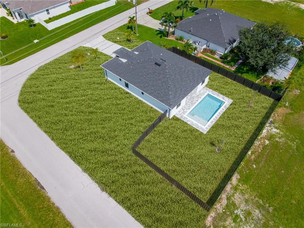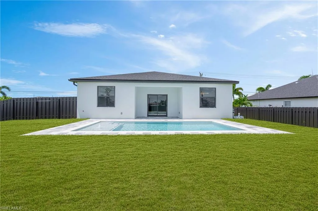 Move-in ready NEW construction pool home in Cape Coral! Just steps from Santa Barbara Blvd, this stunning Roma model sits on a premium corner lot and features high ceilings, 3 spacious bedrooms, 2 stylish bathrooms, and a 2-car garage with driveway. Interior highlights include porcelain tile throughout, impact windows and doors, LED lighting, and a bright open layout. The kitchen offers a quartz waterfall island, sleek cabinetry, and stainless steel appliances perfect for entertaining. Bathrooms include designer finishes; the primary bath has a double vanity and glass shower. Enjoy your private pool and deck ideal for relaxing or hosting. Built with quality craftsmanship and located near top-rated schools, dining, shopping, and parks. Great for families, investors, or as a second home.