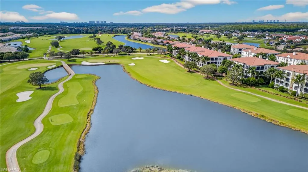 IMMEDIATE GOLF MEMBERSHIP AVAILABLE AT CLOSING! Skip the waitlist and start enjoying the award winning Greg Norman/Pete Dye designed course at TALIS PARK! This captivating TURNKEY condominium features a GOLF COURSE VIEW overlooking holes #4, #3 and #2, a timeless primary suite with hardwood floors in the bedroom and in the custom closet, dual sinks, a bathtub and separate large shower. The captivating great room is impeccably decorated in a neutral decor which blends seamlessly with the soft white cabinetry in the chef inspired kitchen. A natural gas cooktop is a bonus as is the built in bar with both a wine and beverage refrigerator. Two ensuite guest rooms, a den/office with warm hardwood floors/private screened balcony and a lovely powder room combine for a condominium that lives like a true home with 2950 SF of air conditioned living space! The 700 SF wraparound screened loggia can be accessed from the corner sliding doors in the great room, the kitchen or the primary bedroom creating a perfect place to bring the outdoors inside while entertaining a group, dining al fresco or enjoying your morning coffee! An additional storage room in the garage is fitted with a dehumidifier. Two deeded garage parking places are also included in this graceful “lock and leave” residence. Carrara residents and their guests have the use of the private pool on the street and the grill area. In addition to the spectacular golf course, Talis Park residents enjoy the award winning clubhouse (formal and informal dining), Fiona’s casual dining with a pizza oven, the Casa Cortese at the practice range with an outdoor bar and indoor golf simulator, fitness center, spa, bocce, pickleball, tennis, two dog parks, a large community pool, playground and peaceful walking/running paths. The expansive social calendar is sure to impress with something for everyone. Located between Olde Naples and RSW Airport, it’s a premier locale. Shopping, dining and beaches are also in close proximity.
