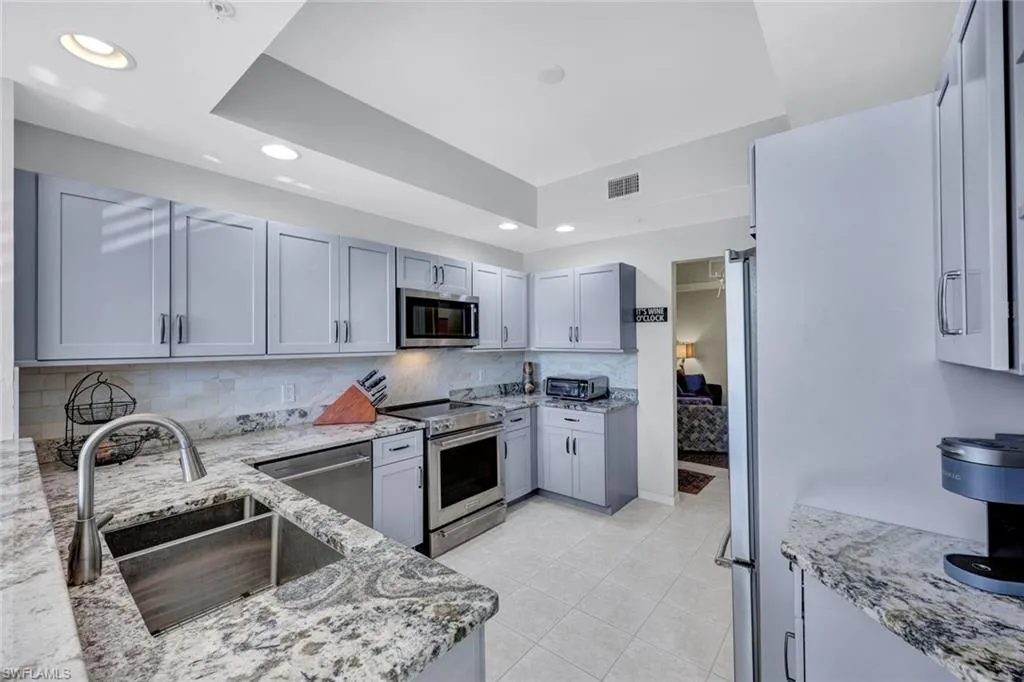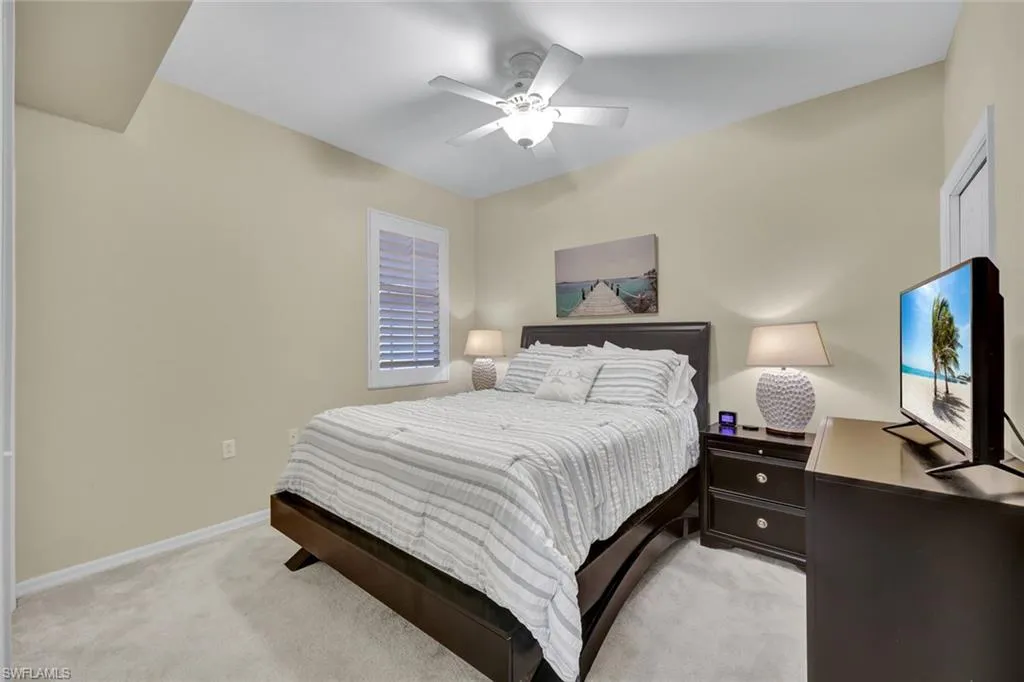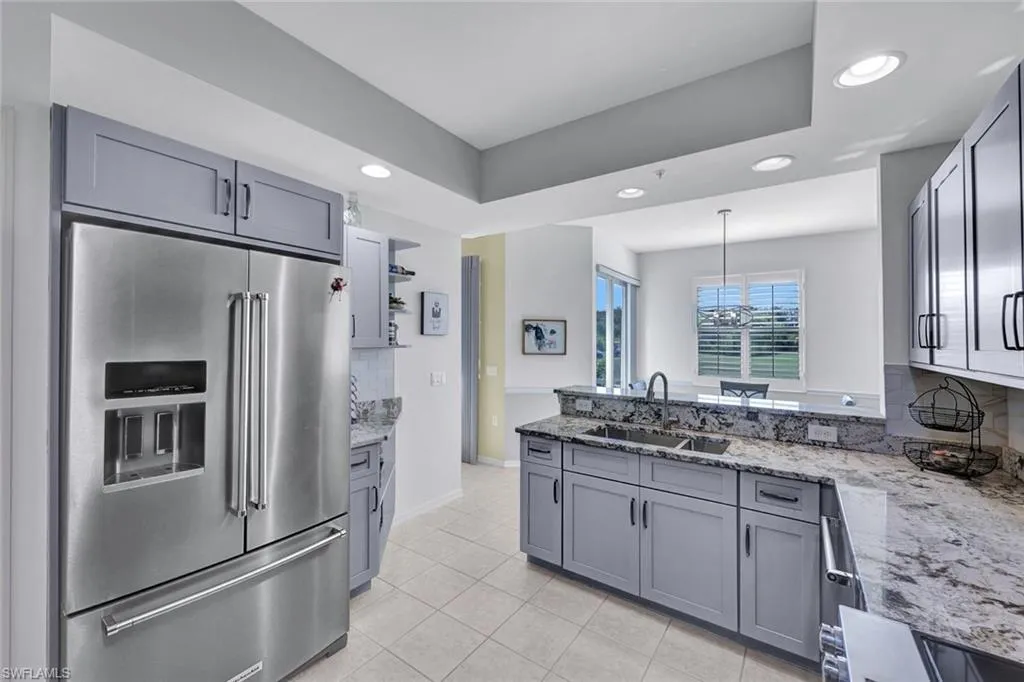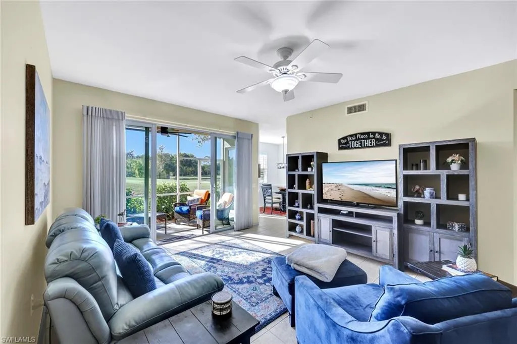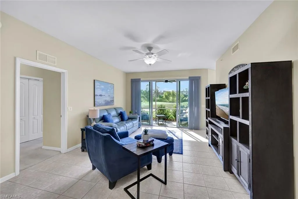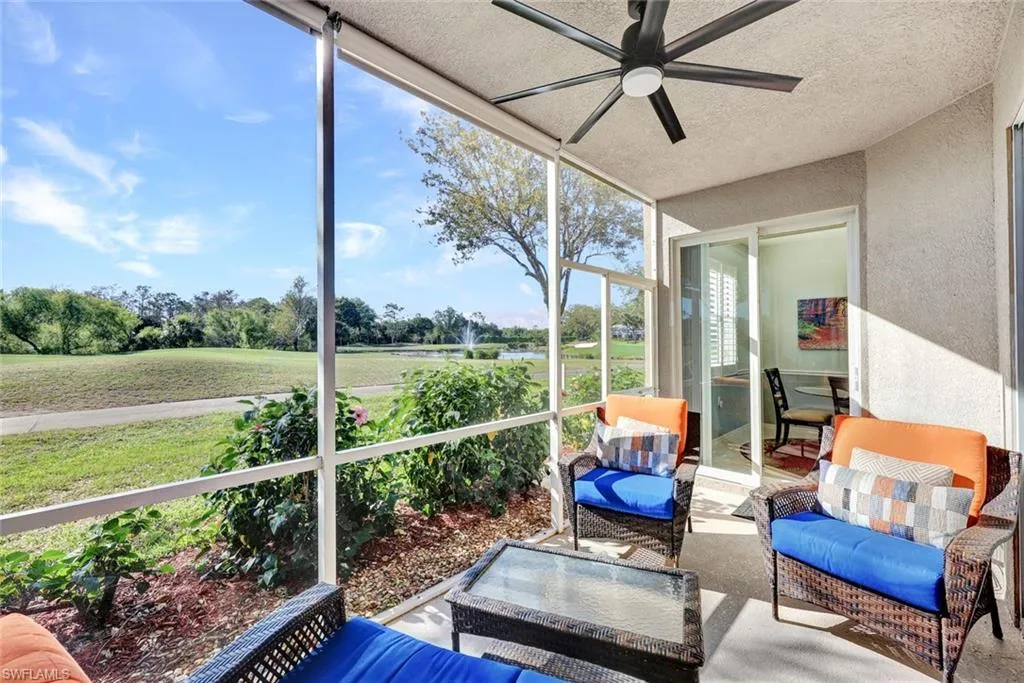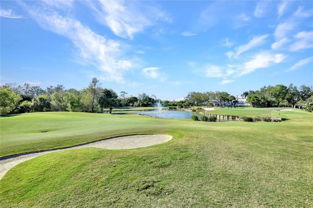 Experience luxury golf course living in North Naples in this beautifully furnished, turnkey first-floor condo overlooking the 7th fairway of a championship bundled golf course. Enjoy breathtaking views and a short stroll to the clubhouse for a round of golf or a meal at the private members-only restaurant. The light-filled interior features an updated kitchen with sleek gray cabinetry and pullouts, granite countertops, and stainless-steel appliances. The spacious dining area is ideal for entertaining, while a built-in desk provides a convenient workspace. With three bedrooms and two full baths—each with pullout cabinetry—this home combines comfort and functionality. Additional highlights include a private entrance, two-car garage, and secure gated entry. Residents enjoy world-class amenities such as an 18-hole bundled golf course, eight pickleball courts, two tennis courts, a 24-hour fitness center, resort-style pool, scenic walking trails, bocce courts, and an active social calendar. Offered fully furnished and move-in ready, this is your opportunity to embrace the Naples lifestyle in one of the area’s most desirable golf communities.