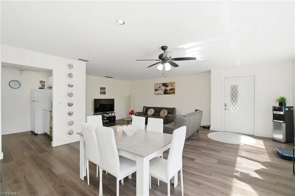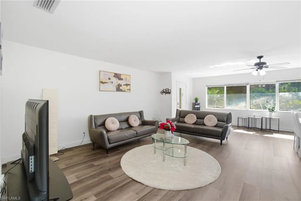 This nicely updated 2nd floor condo offers comfortable, and convenient living in SWFL. Featuring 2 bedrooms and 1 bathroom, this thoughtful layout provides plenty of natural light for the 942 sqft of living space. The home has been freshly painted and updated with luxury vinyl flooring throughout, electric storm shutters, laundry in residence, and an AC unit in 2023! This end unit is located close to downtown Fort Myers for easy access to shopping, dining, and entertainment options. Low condo fees make this an affordable and attractive choice for those seeking a peaceful, move-in-ready home in a 55+ community.