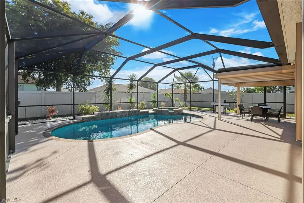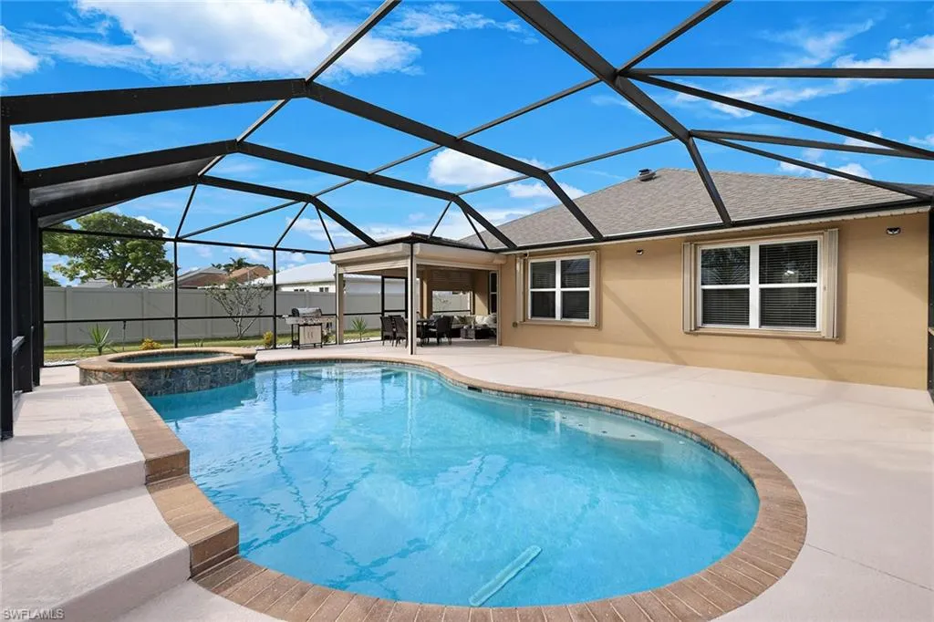 Welcome to your private pool and Spa oasis in the heart of Cape Coral! Step into this beautiful 3-bedroom, 2-bath pool home and feel the perfect balance of style, comfort, and peace of mind. Inside, natural light fills the spacious open layout designed for easy everyday living and effortless entertaining. The heart of the home opens seamlessly to your extended screened lanai, where you’ll fall in love with the truly exceptional sparkling saltwater pool and spa featuring a self-cleaning system, electric heater, color-changing pool LED lights, a soothing waterfall feature, and freshly painted pool deck. Best of all, with the Pentair automation system, you can control and monitor your pool right from an app on your phone -adjust the temperature, change the lighting, monitor salt levels, and check the water from anywhere in the world. Enjoy year-round comfort and security with a new roof (2023), electric roll-down shutters on the front door, window, and lanai, and accordion shutters on the side of the home. A full-house gas and propane generator ensures peace of mind during any season. The fenced yard with dual gates provides privacy and convenience for pets and outdoor activities. Perfectly located close to shopping, dining, and everything Cape Coral has to offer. Come see why this one checks all the boxes-schedule your private showing today and fall in love with your next home!