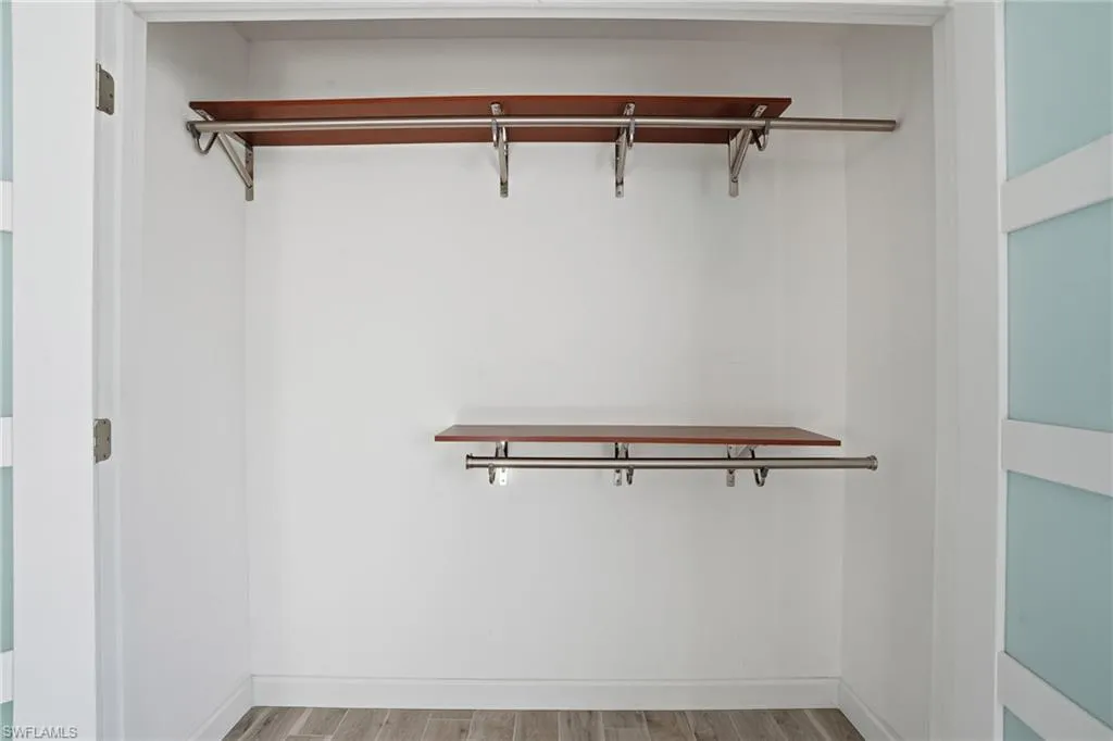 Two updated guest bedrooms are located just off the kitchen, featuring new wood plank tile flooring and upgraded closets with elegant frosted glass French doors. Between them sits a beautifully remodeled guest bath, complete with white shaker cabinetry, granite countertops, new tile flooring, and a luxurious jacuzzi tub for the ultimate relaxation.
