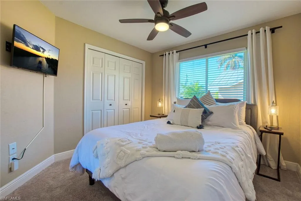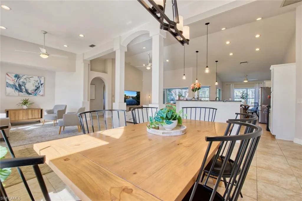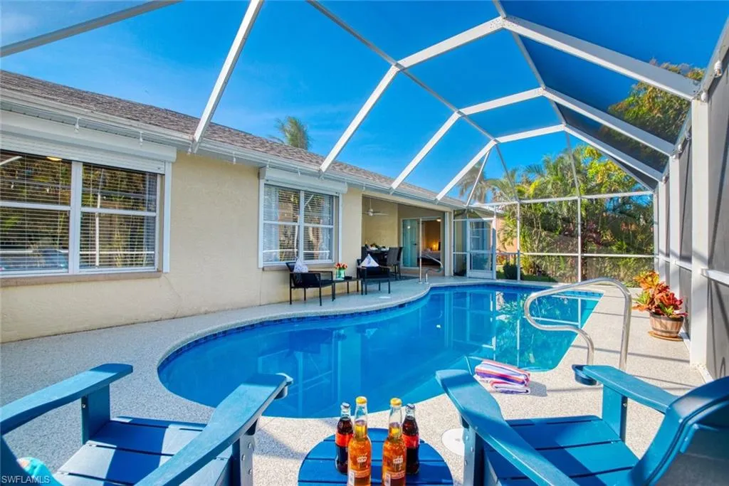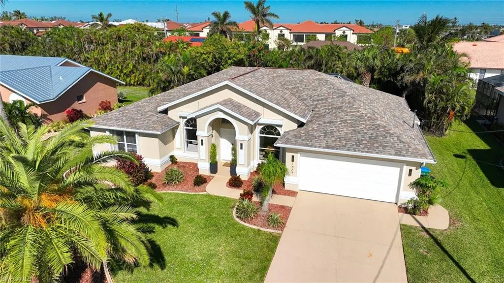 Welcome to your beautifully updated and fully furnished 4-bedroom, 2-bath retreat with 2,036 sq ft under air (3,399 total), offering modern comfort, style, and immediate income potential. Currently leased for $4,500 per month from November through June, you can choose to continue the rentals or begin enjoying it yourself right away. The seller’s transferrable flood insurance policy at $1,353 per year adds peace of mind and long-term value. This turnkey home comes completely furnished, ready for effortless living or hosting. Inside, soaring vaulted ceilings and beautiful natural light highlight a modern open floor plan that seamlessly connects the living, dining, and kitchen areas for easy entertaining. The chef’s kitchen showcases granite countertops and backsplash, stainless steel appliances, a five-burner stove, double sink, and an oversized refrigerator with ice and water dispenser. The luxury primary suite offers a king bed, 65-inch TV, dual vanities, private toilet room, walk-in shower, soaking tub, linen closet, and spacious walk-in closet. Every guest bedroom includes a queen or king bed and flat-screen TV, creating comfort and privacy for all. Recent updates include a 2023 AC, new pool heater, water heater, washer/dryer, light fixtures, epoxy garage floor, upgraded deck lighting, and a resurfaced pool deck with new lanai screening. You’ll also find a 2023 electrical panel with whole-home surge protection, portable generator hookup, new automatic garage door opener, electric shutters on the front and lanai, automatic sprinklers, and flat-screen TVs throughout, including the lanai. Outside, your fenced backyard is surrounded by tall palms and two mature mango trees, creating a private tropical escape around the heated pool and screened lanai. Ideally located in one of Cape Coral’s most desirable no-HOA neighborhoods, you’re minutes from shopping, dining, and Southwest Florida’s best beaches. Whether you’re seeking a primary home, vacation getaway, or income-producing investment, this property is the total package. Schedule your private showing today and discover turnkey living at its finest.