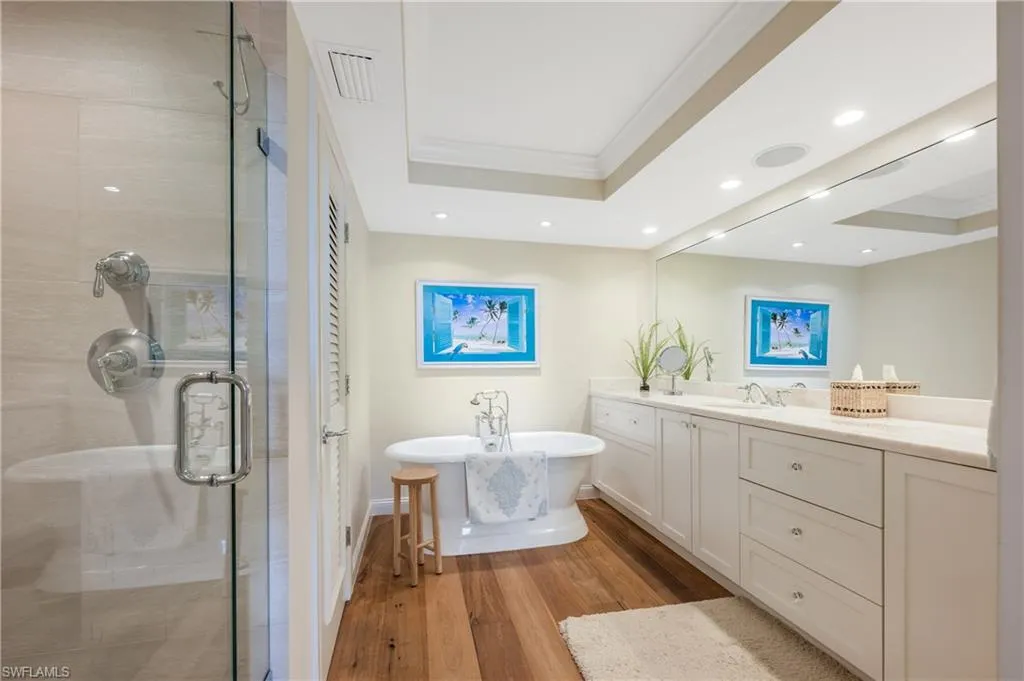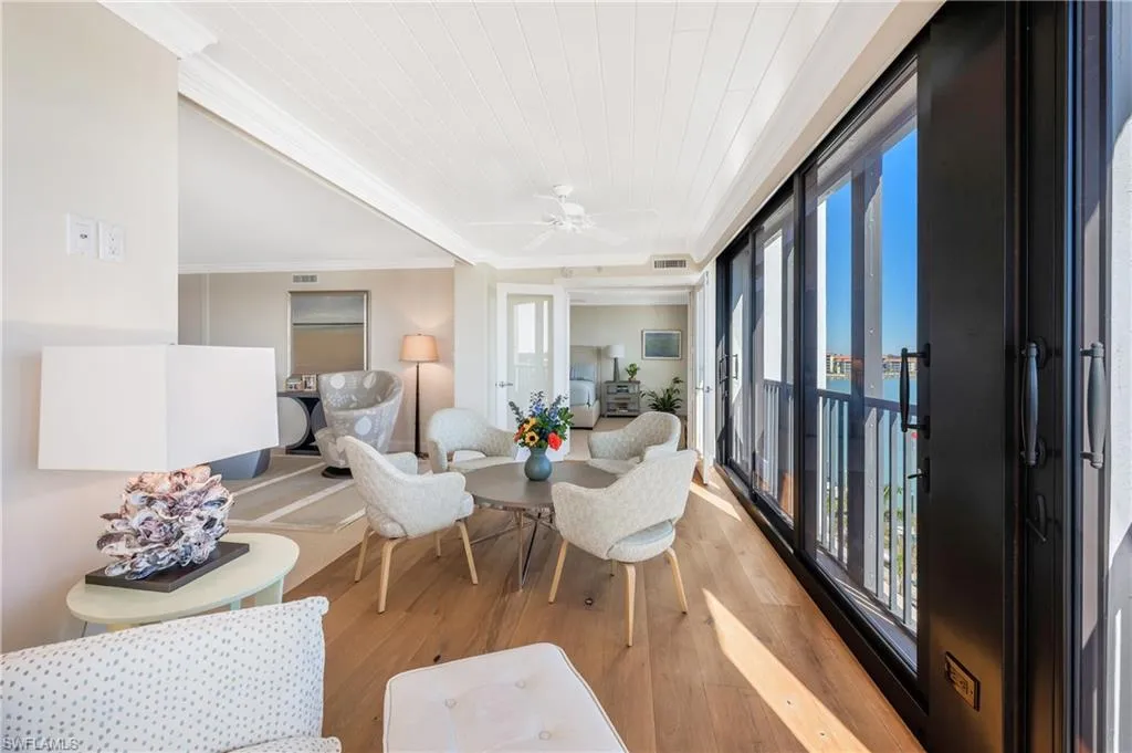 Welcome to the resort lifestyle in the bay and beachfront neighborhood of Admiralty Point. This fifth floor corner home is located on the prime southern side of the building and has panoramic water views of the bay, Doctor’s Pass and the Gulf! See the rising sun and sunsets all from your home while you watch the dolphin and boaters going to and from the Gulf of Mexico. This three bedroom home with an open floor plan, is ideal for entertaining and offers large windows with fantastic natural light. It has been thoughtfully designed with wide plank floors, gourmet kitchen, granite counters, high end appliances, custom cabinets and a cozy banquette by an open balcony. Custom shutters, remote blinds, built-ins, split bedrooms, custom closets all enhance this beautiful home. The primary suite has dual sinks, two walk in custom closets, separate shower and tub. Additional storage and one car garage are attractive features. Admiralty Point sits on 10 acres and has extensive amenities including boat docks for lease, direct beach access, pools (bayside and gulfside), two clubhouses, spa, BBQ, exercise room, Har-Tru tennis courts, shuffleboard, vehicle wash area, and winding paths for all resident’s enjoyment. Located between 5th Avenue and Venetian Village it is close to all the top rated dining and shopping pleasures offered in Naples. A wonderful place to call home!