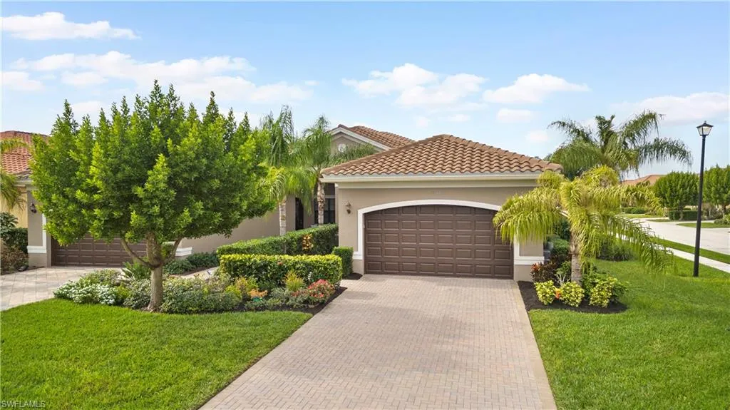 Perfectly maintained Marina Bay Villa is situated on a large corner lot with an extra long driveway. This villa is in like-new condition with upgrades including quartz countertops, SS appliances, extra tall ceilings, new carpeting, freshly cleaned air ducts, new water heater, new dishwasher, guest bedroom closet install, and more. The front and rear lanais are screened in and the rear lanai has lush landscaping offering total privacy. Offering 2 large bedrooms and an enclosed office, 2 bathrooms, and 2 car garage. Marina Bay has resort-style amenities including a clubhouse pool, lap pool, kid splash zone, pickleball and tennis courts, fully equipped fitness gym, indoor basketball, and more. The community is gated with a 24 hour guard present. Centrally located minutes to shopping, entertainment, RSW International Airport, dining, FGCU, and award winning beaches.