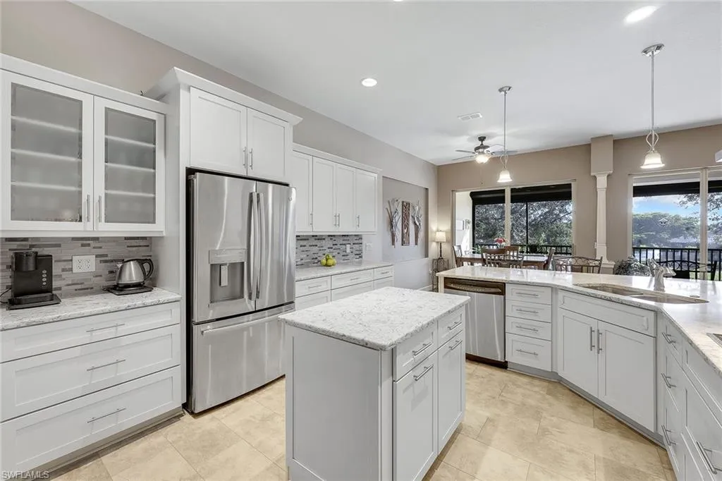 Step into this beautifully updated Monterosso floor plan carriage home, showcasing one of the most inviting lake views in The Club at Rapallo. From the moment you walk in, the thoughtful upgrades and warm, welcoming layout make this home truly stand out. The completely renovated kitchen is designed for those who love to cook, entertain, or simply enjoy an elegant space. It features extended cabinetry with under-cabinet lighting, quartz countertops, stainless steel appliances, a custom vent hood, a built-in microwave and oven, and abundant storage. Every detail is both stylish and functional. The open layout flows seamlessly into the dining and living areas with wood laminate flooring, creating a comfortable and connected atmosphere. Your primary suite offers an elegant renovated bath with new vanities, custom mirrors, cabinetry topped with quartz countertops, laminate flooring, and a tastefully remodeled walk-in shower. One of the guest bedrooms is exceptionally spacious, complete with a Murphy bed and a charming Juliet balcony – perfect for hosting family and friends in style. Indulge in your spacious screened-in lanai, where gentle breezes and shimmering fountain views create the perfect backdrop for Florida living. With Storm Smart solar screens, impact-resistant windows and doors, a new roof (2023), and AC (2023), this home provides both comfort and peace of mind year-round. The Club at Rapallo offers resort-style amenities, including a clubhouse with indoor and outdoor seating, two lagoon-style pools plus two satellite pools, a screened-enclosed lap pool, a state-of-the-art fitness center, five clay tennis courts with an onsite pro, bocce ball courts, bike and jogging trails, and beautiful lakes with fishing piers and fountains. The location couldn’t be better—just a short distance to Coconut Point Mall, with convenient access to SWFL International Airport, top-rated medical facilities, and the area’s finest beaches, dining, and entertainment. From morning workouts to sunset strolls and community gatherings, every day at Rapallo feels like resort living. This is the lifestyle you’ve been waiting for-schedule your private tour today and fall in love the moment you step inside.