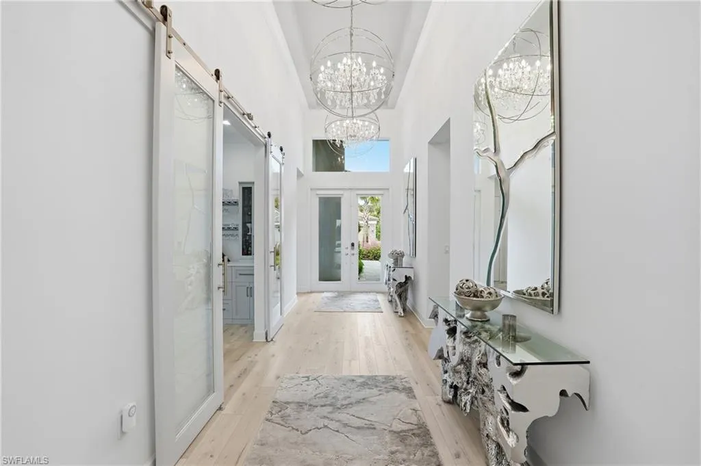 The primary suite serves as a private sanctuary with two custom walk-in closets, an additional shoe closet, dual sinks, and an expansive walk-in shower. Each guest bedroom offers its own custom walk-in closet and en-suite bath, ensuring comfort and privacy. The home also features Robb & Stucky window treatments, upgraded mirrors, bespoke light fixtures, and custom designed barn doors, all enhancing its distinctive contemporary charm. Crown molding throughout adds a refined finishing touch.