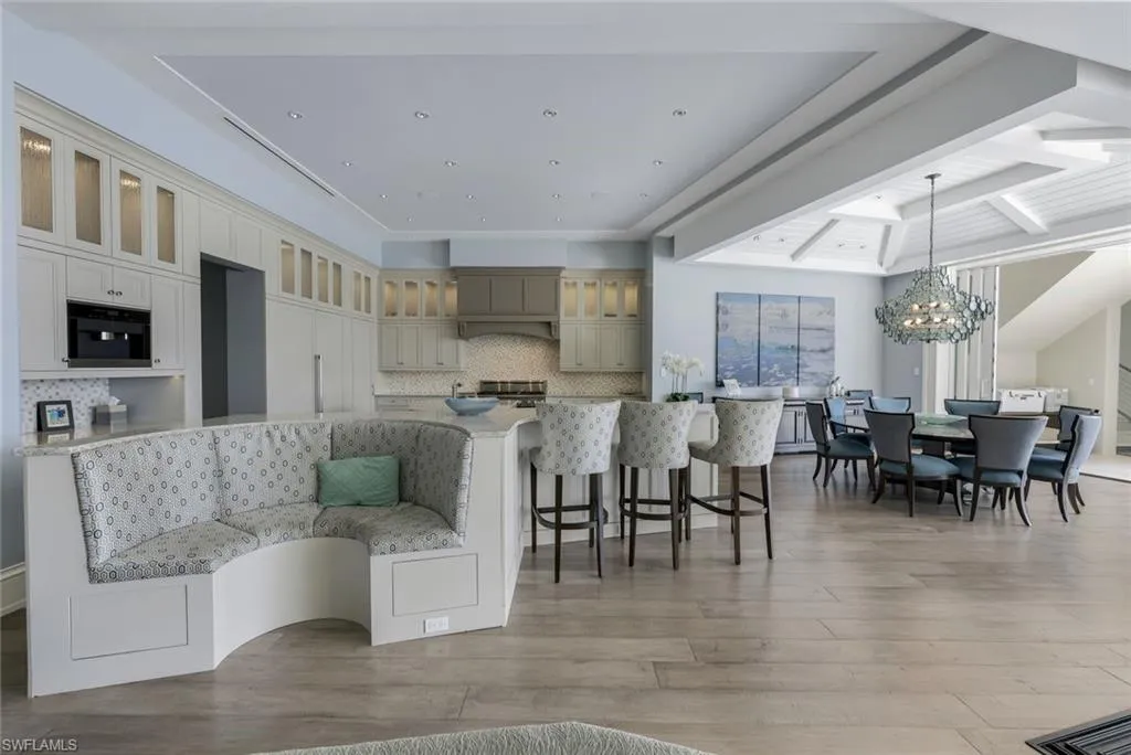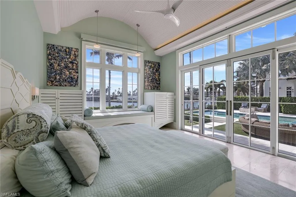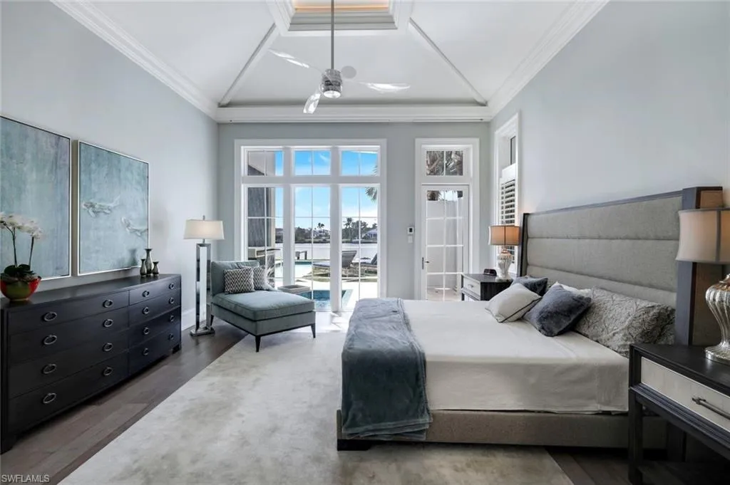 Live in casual elegance in this beautiful custom bay front home in The Moorings, timelessly designed by Harrell & Company Architects on just under a private ½ acre premier southern exposure lot. This private oasis has been professionally decorated with a coastal flair. Watch the dolphins and eagles on Hurricane Harbor from the great room’s floor to ceiling windows with zero corner sliding doors for seamless indoor-outdoor living and entertaining. Upgrades galore…a soaring back lit quartz accent wall, cathedral ceilings with beautiful mill work; each ceiling a masterpiece, an indoor/outdoor bar, perfect for entertaining. There is a private elevator, Lutron lighting, two laundry rooms, two powder rooms and three car garages. The kitchen will delight your inner chef with professional grade appliances, gas six burner range, two dishwashers, walk in pantry and Miele built-in coffee machine. The first-floor master suite features a large walk-in closet with a dressing area and laundry room, private outdoor shower and a lovely view of the bay and the spa with waterfall. The study doubles as a guest bedroom, two queen-size Murphy beds, the second-floor hosts 2 additional bedrooms and baths, wet bar, family room loft and bayfront deck with a firepit. Overlooking the pool and bay you will find the cabana with bedroom and bath. The travertine lanai features a covered dining and living areas with wet bar, TV, grilling area, retractable screens, and shutters. The sparkling pool and spa are located on the terraced lawn featuring a firepit, several seating areas leading to the bay front deck with boat and jet ski lifts. Built in 2016 using the highest quality materials by D. Garrett Construction at a high elevation, this home has never been damaged by hurricane or storm surge. For your peace of mind there is a security system with cameras, high impact glass windows & doors, all at a high and dry elevation. This house is a true showplace. The Moorings is conveniently located west of 41 in the City of Naples and features a private residence Beach Club. Two miles from 5th Avenue and all that Naples has to offer. Location, Luxury and Beauty!