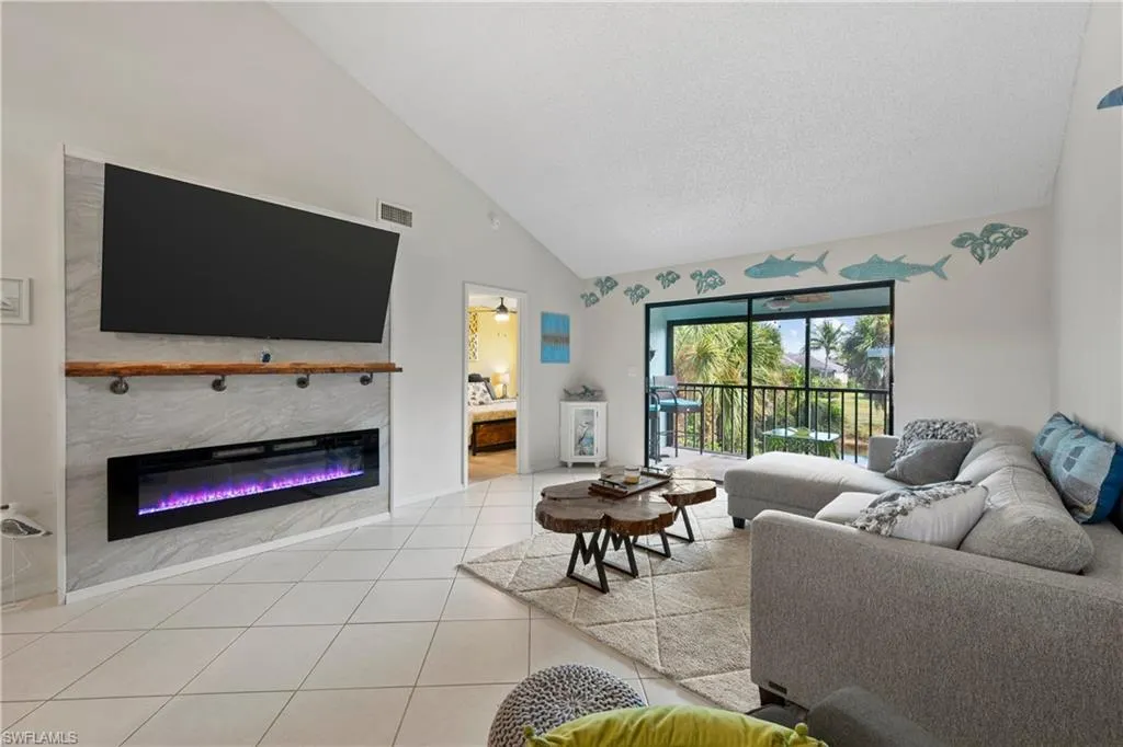 Beautifully updated and fully furnished 2nd Floor Condo with 2 Bedrooms / 2 Bathrooms and a private 105-sq-ft lanai. Condo has been repainted and modernized with an electric fireplace wall feature, stainless steel appliances, new ceiling fans and fixtures, and all-new bathrooms with updated vanities and frameless glass shower enclosures with ceiling-to-floor tile. The kitchen has updated countertops and cabinetry as well. Plus, solid surface flooring throughout (no carpet!) with luxury plank LPV in bedrooms and diagonally-laid neutral tile in the main living areas. Community amenities include: a clubhouse with meals and bar, a community pool, tennis and pickleball courts, public golf course and a boat ramp with gulf access! In fact, for only $500 you can store your boat here for the whole winter! And this unit in particular, with its sunny private lanai, looks over the gulf access canal. Buildings have been recently repainted and the carports are new (with all assessments PAID). HOA dues cover the water and cable, building insurance and maintenance, and the amenities and common areas. Condo fee is only $359/month and the master association is only $260/month, making this home a smart choice! Conveniently located in southern Fort Myers, with quick access to the beaches and shopping destinations in both Fort Myers and Estero / Bonita Springs / Naples.