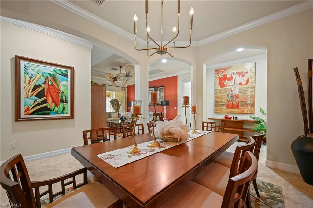 The kitchen is the heart of the home, featuring a large island-style layout with upgraded cabinetry, granite countertops, and quality appliances. Custom built-in cabinetry offers extra storage and two wine refrigerators — because one is never enough. Crown molding, tray ceilings, plantation shutters, window treatments, and neutral tile floors give this home a clean, finished look from room to room.