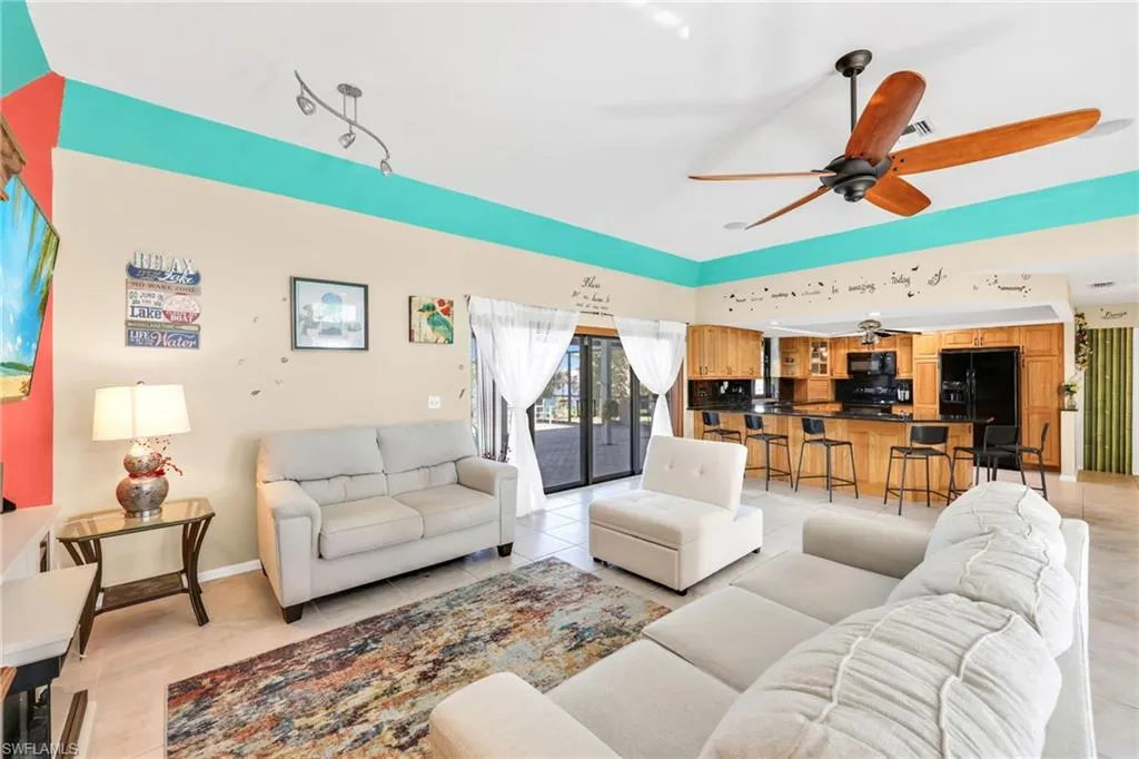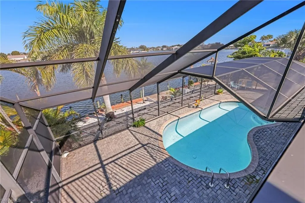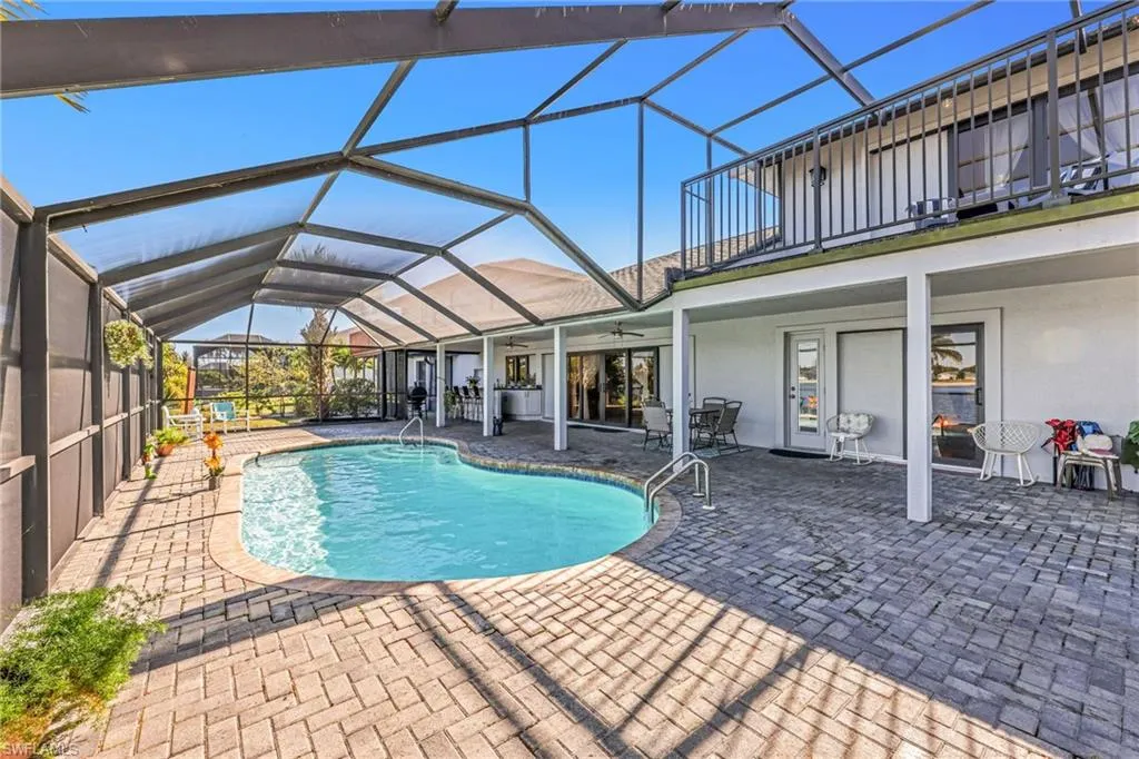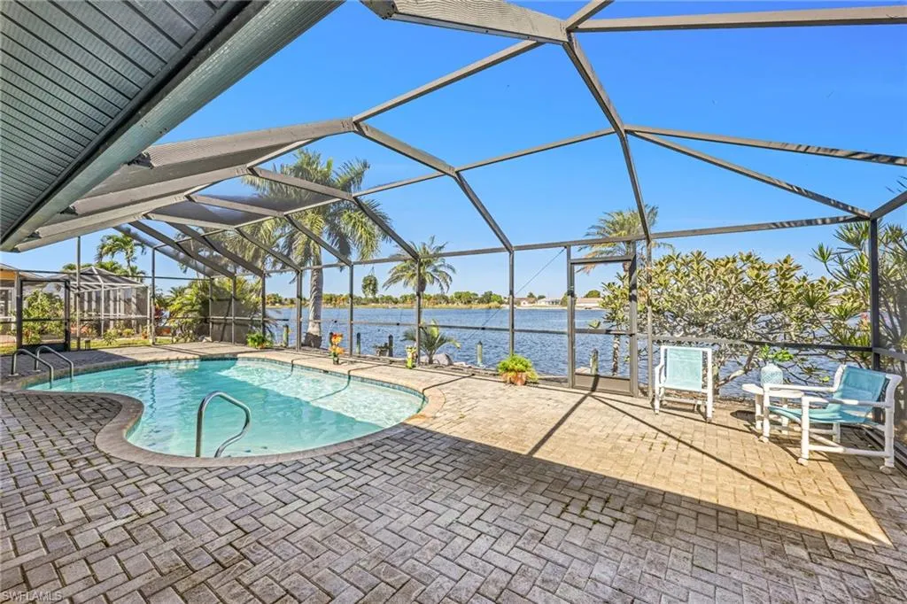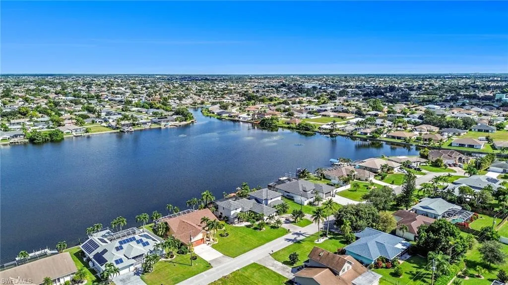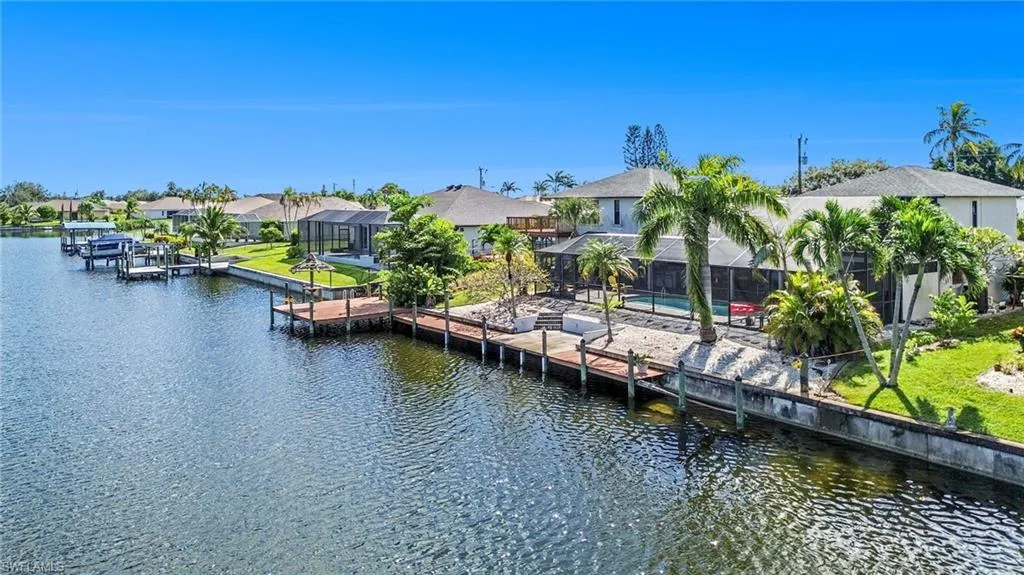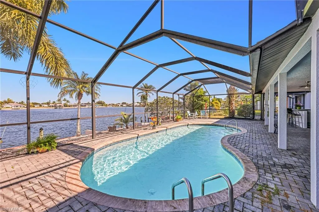 Rarely found on the market. Experience the ultimate in waterfront living on beautiful Lake Saratoga — one of the largest lakes in Cape Coral. This luxurious 2-level home offers 3,982 sq.ft. of elegant living space with a breathtaking 180° view and 120 feet of pristine lake frontage. Enjoy endless days kayaking, motor boating, fishing, or simply relaxing on your private dock surrounded by peace and tranquility. The home features 4 spacious bedrooms, 3.5 bathrooms, a full kitchen with eat-in island, and a private master suite with balcony and double-sink vanity. Entertain effortlessly with a heated pool, wet bar, BBQ area, screened lanai, and beautifully lighted grounds. Fully furnished and turnkey, with all utilities included — perfect as a primary home, vacation retreat, or high-income rental. Multi-generational floor plan allows flexible living or partial rental options. Gulf access and close to Fort Myers shopping, dining, and beaches — this is Florida living at its finest. A/C 2023, Water heather 2021, Roof 2023.