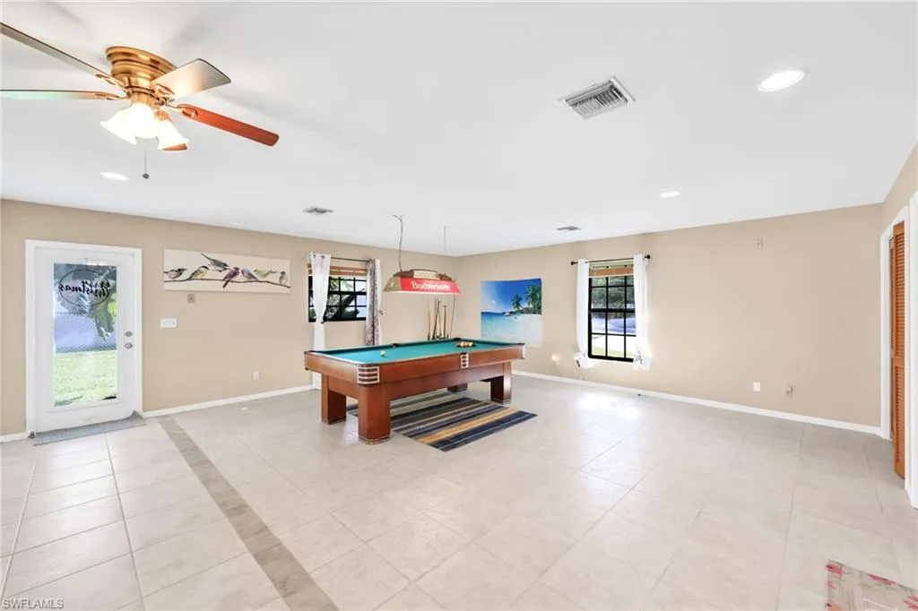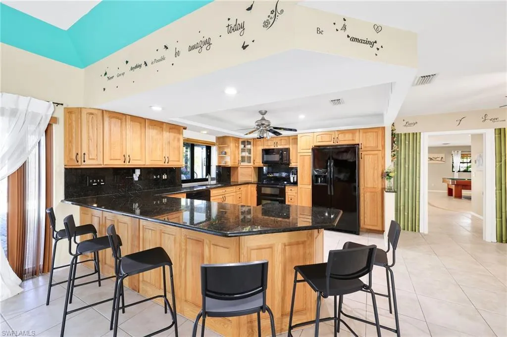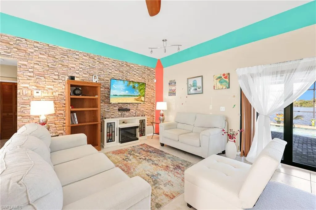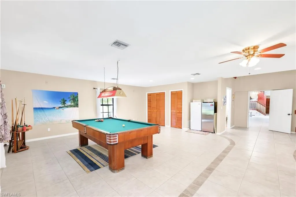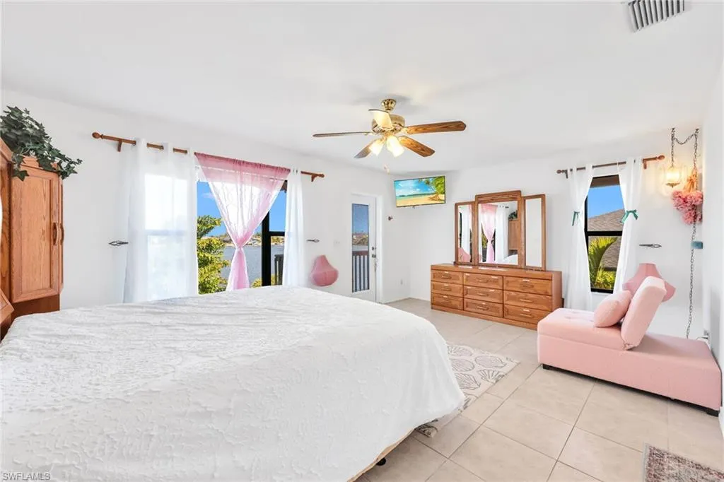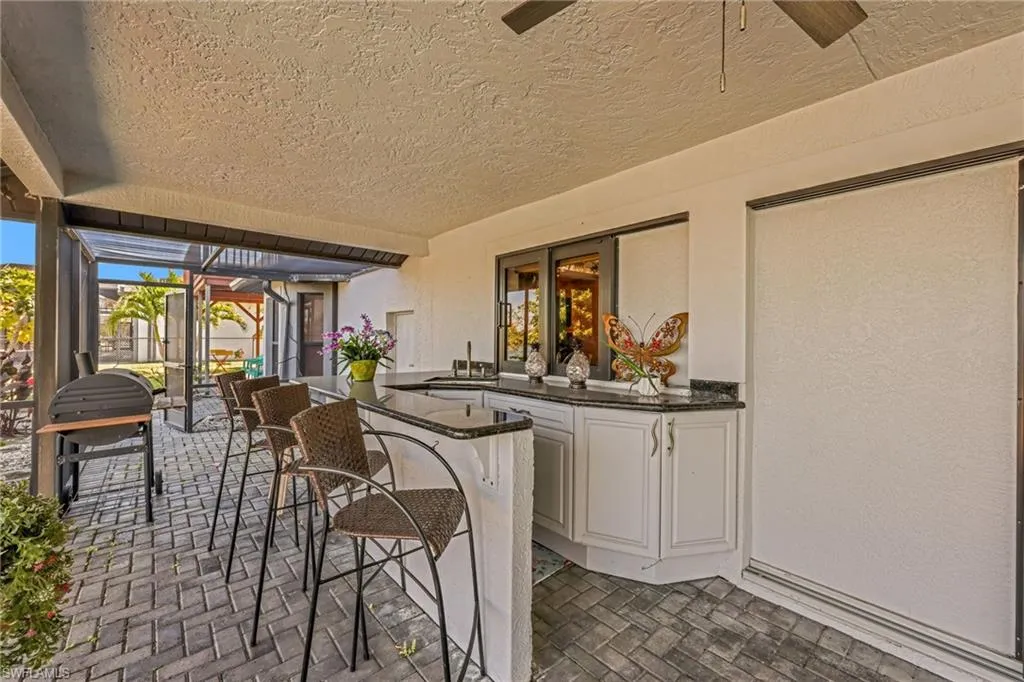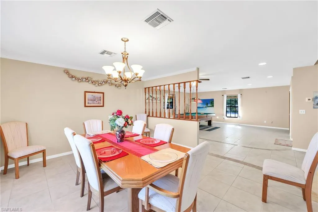Rarely found on the market. Experience the ultimate in waterfront living on beautiful Lake Saratoga — one of the largest lakes in Cape Coral. This luxurious 2-level home offers 3,982 sq.ft. of elegant living space with a breathtaking 180° view and 120 feet of pristine lake frontage. Enjoy endless days kayaking, motor boating, fishing, or simply relaxing on your private dock surrounded by peace and tranquility. The home features 4 spacious bedrooms, 3.5 bathrooms, a full kitchen with eat-in island, and a private master suite with balcony and double-sink vanity. Entertain effortlessly with a heated pool, wet bar, BBQ area, screened lanai, and beautifully lighted grounds. Fully furnished and turnkey, with all utilities included — perfect as a primary home, vacation retreat, or high-income rental. Multi-generational floor plan allows flexible living or partial rental options. Gulf access and close to Fort Myers shopping, dining, and beaches — this is Florida living at its finest. A/C 2023, Water heather 2021, Roof 2023.