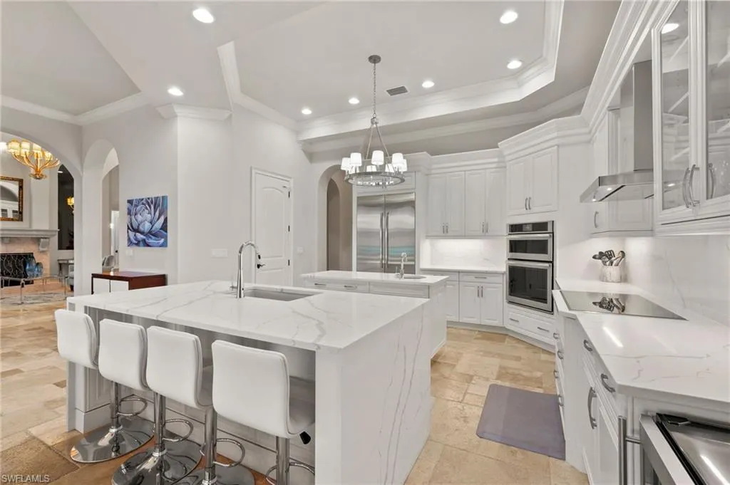 IMMEDIATE GOLF MEMBERSHIP AVAILABLE. Experience breathtaking views overlooking the 13th hole of The Lakes Golf Course from this exquisite residence, where every bedroom features its own en suite. Step through elegant double glass and metal-accented doors into a grand foyer that immediately showcases the home’s fine craftsmanship from the tumbled tile flooring to the soaring coffered and tray ceilings. The spacious living room centers around a gas fireplace and dramatic floor-to-ceiling windows that frame the picturesque outdoor living area .An entertainer’s dream, the residence features a stylish wet bar and a beautifully appointed office with custom built-in cabinetry. The gourmet kitchen seamlessly flows into the family room, showcasing dual islands, premium finishes, and expansive zero-corner sliders that open fully to the lanai—blurring the lines between indoor and outdoor living. Outside, enjoy the ultimate alfresco experience with a fully equipped outdoor kitchen, bar, and generous covered seating areas. The sparkling saltwater, gas-heated pool and integrated spa create a private resort setting, perfect for relaxing or entertaining against the backdrop of sweeping golf course vistas. Notable upgrades include spray foam insulation with an air-conditioned garage, updated HVAC systems, a whole-house generator, electric hurricane shutters, impact-resistant windows, a metal roof with a 50-year warranty, and 17-inch gutters.A perfect harmony of elegance and liveability, this remarkable residence embodies the very best of luxury golf course living in Southwest Florida.