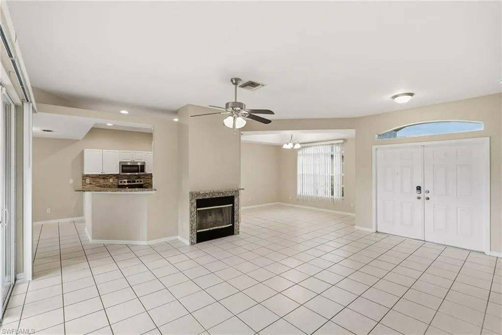 Charming single-level home featuring 4 bedrooms, 2 bathrooms, and a 2-car garage. The inviting living room showcases a cozy fireplace and accent lighting visible from the dining area and kitchen. The kitchen offers a decorative backsplash, stainless steel appliances, and a pantry. Enjoy a spacious primary suite with a double vanity and a relaxing retreat outdoors with a screened lanai, private pool, and spa. A double-door front entry adds elegance and curb appeal.