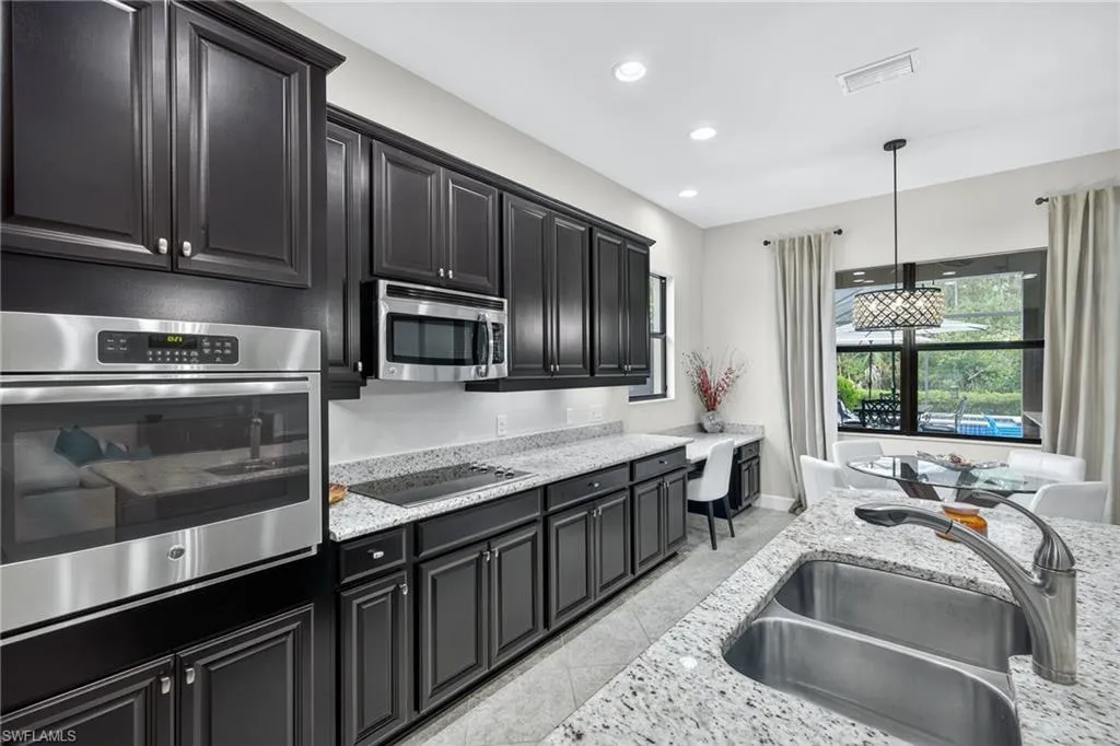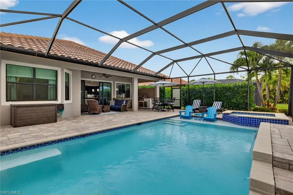 Beautifully maintained and move-in ready, this spacious 3-bedroom + den, 2 1/2-bath, single-family home features the largest floor plan available in Bonita Isles. The gourmet kitchen opens to a bright family room with sliding doors leading to a large screened lanai with built-in outdoor kitchen perfect for entertaining. The primary suite offers two oversized walk-in closets, dual vanities, and a large walk-in shower. Two guest bedrooms share a private bath with a pocket door for added privacy. The home also includes a formal dining room ideal for larger gatherings or a potential home office space and a separate den/flex space. All windows and doors are impact resistant and home is located outside a flood zone.