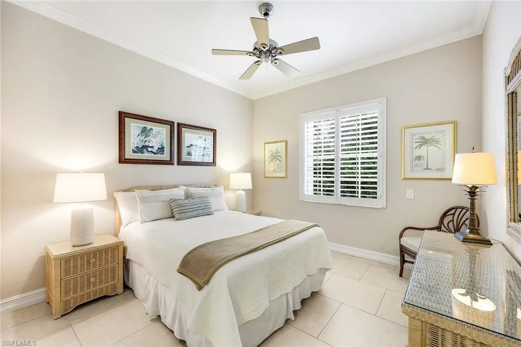 Experience the best of Naples’ resort lifestyle in this beautifully renovated, light-filled end-unit at Breakwater in Pelican Bay. Perfectly positioned with southern exposure and expansive lake views, this stunning three-bedroom home combines timeless elegance with modern sophistication. Step inside to discover a reimagined open-concept great room floor plan bathed in natural light, highlighted by 10-foot ceilings with crown molding, walls of plantation shuttered windows, and large-format tile flooring that adds continuity throughout the home. Serving as a centerpiece, the custom-designed kitchen features exquisite soft-close light wood cabinetry, quartz countertops, and a classic subway tile backsplash, creating a stylish haven for both casual and formal entertaining. Off the kitchen is a flex space that could be personalized as a casual dining area, reading nook, or home office. The great room flows naturally into a sun-filled Florida room with floor-to-ceiling impact rated sliding glass doors, extending the living area and inviting the outdoors in. Savor morning coffee as birds glide across the water or unwind in the evenings beneath a canvas of breathtaking sunset skies. Thoughtful upgrades including motorized Hunter Douglas sun shades, electric storm shutters, and custom closet built-ins, combine elegance with effortless functionality. The oversized two-car garage is the finishing touch that brings both practicality and prestige to this exceptional residence—an uncommon luxury in Pelican Bay.