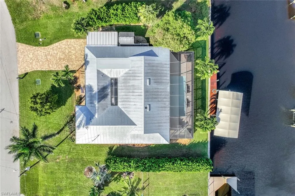 COMPLETELY UPDATED GULF ACCESS POOL HOME — 2 MINUTES TO OPEN WATER! Nestled in one of Cape Coral’s most sought-after boating neighborhoods! From the moment you arrive, the paver driveway, lush mango tree, and METAL ROOF set the tone for the relaxed coastal lifestyle. A unique and private screened front courtyard, decorative river rock accents, Calusa privacy hedge, enhance curb appeal and functionality. Step inside to discover an OPEN CONCEPT layout filled with natural light, FLOOR-TO-CEILING windows, and porcelain tile flooring that looks like rich wood. The MODERN kitchen impresses with soft-close shaker cabinetry, glass tile backsplash, eye popping granite countertops, oversized 6×5 center island, newer stainless steel appliances, wall oven, cooktop, farmhouse sink, and plenty of prep and serving space. The open living and dining areas flow seamlessly to the screened lanai through pocket sliding glass doors, enhancing the WATERFRONT VIEWS and creating an seamless indoor/outdoor lifestyle. Enjoy the HEATED chlorine 9 foot deep pool with cascading waterfalls, brick paver sun deck, and covered seating area. BRING YOUR BOAT as home features a 10,000-lb boat lift with canopy, wrapped pilings, water and electric at the dock ALL NEWER! There’s NO BRIDGES to slow you down so you’ll be out on the river in 2 minutes. The primary suite is a retreat of its own, featuring crown molding, custom blinds, and a flex space ideal for a home office, nursery, or gym. The massive (previously the 4th BR) walk-in closet offers custom built-ins, washer and dryer, and a built-in safe. The ensuite bath feels spa-like with dual sinks, quartz countertops with glass backsplash, seamless shower enclosure, custom lighting, rain showerhead, and a steam feature for true relaxation. Guest accommodations include two spacious bedrooms—one with a built-in window seat or book nook—and a modern guest bath with earth-tone finishes, quartz vanity, and glass shower doors. The 1 car garage features storage, a sink with filtered water, and newer water heater PLUS there is additional covered parking on the side! Every detail, from the decorative paver drive to the lush tropical landscaping, has been thoughtfully imagined and cared for. Are you looking for a home with modern updates and premium boating access and ALL the updated inside and out? Come see this one! Furnishing package available for a turnkey option perfect for investors! You deserve to be close to everything that SWFL has to offer: boat, kayak, jet ski, fish; or take a dip in your private oasis!