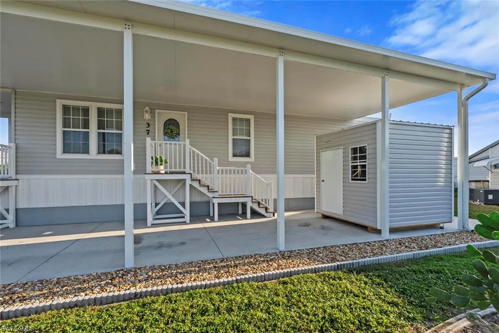 Own the land in Thunderbird Park! This 2023 Jacobsen home (ALL new since post-Ian except the lot!) is modern, charming, light, airy with so much to offer w crown moldings throughout, skirting anchored w hardie board, shed (11/05/25), extended & widened drive (say toys!!), continuous greige vinyl beachy flooring throughout, shaker cabinetry, fully covered porch, composite deck and stairs, kitchen island w extra storage, ceiling fans, stainless appliances, full-sized washer & dryer. Have peace of mind w Wind Zone 3 rating (highest current rating for wind safety in manufactured homes), featuring hurricane-resistant designs w wind-load rated roofs, impact-resistant windows, and reinforced wall systems; nothing to do but lock it when leaving! The carport is constructed w insulated panels & 4” beams, attached to roofline. The primary has two walk-in closets, while the guest has one. The community offers a remodeled clubhouse w many clubs & activities, including a pool, shuffleboard, bocce ball, horseshoes; 37 Ronald is only one block away. Prime location! Thunderbird ideally located… a few short miles to Fort Myers Beach & Sanibel with restaurants & shops abound locally.