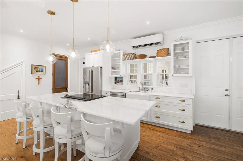 Step into timeless Old Florida charm. Tucked away on a peaceful street, this custom-built Old Florida farmhouse cottage blends country living with the comforts of modern living. Though recently built, its classic clapboard siding, metal roof, and inviting screened and open porches evoke the grace and character of vintage coastal homes. Inside, sunlight dances across Southern Pine wide-plank floors, leading you through an airy open layout that feels both relaxed and refined. The white chef’s kitchen gleams with café stainless steel appliances and elegant marble countertops, while handcrafted doors and Carrara marble baths with vintage sideboard vanities add an unmistakable touch of artistry and warmth.