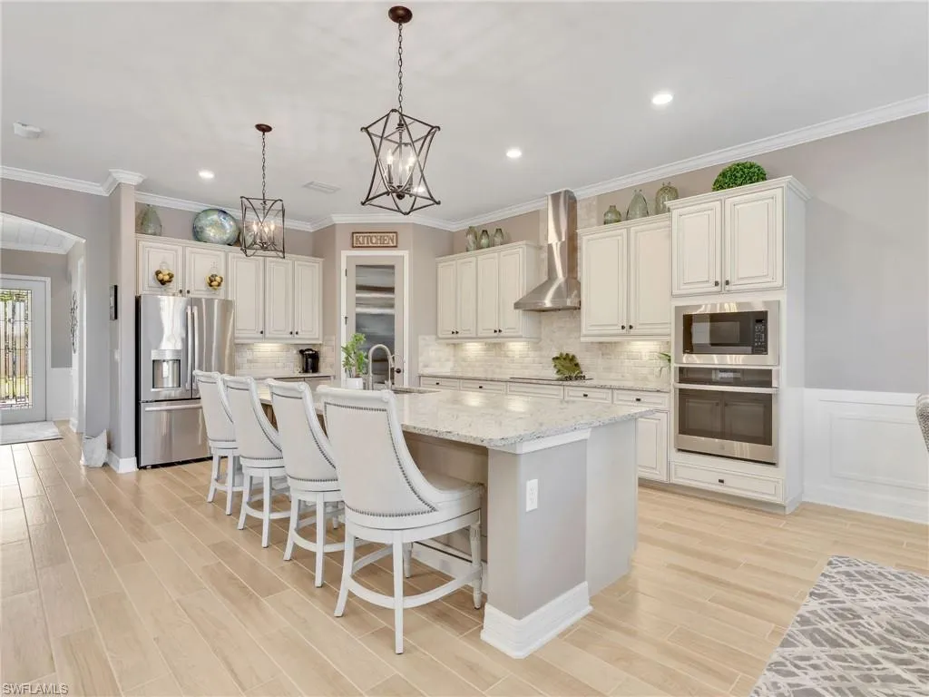 Inside, this fully integrated Google Smart Home features plank tile flooring, fresh interior paint, plantation shutters, custom drapery, designer lighting, and custom closets throughout. The kitchen impresses with upgraded cabinetry, stainless range hood, under-counter wine cooler, custom backsplash, and wainscoting in the formal dining area. The living room showcases a shiplap ceiling, custom entertainment wall with fireplace.