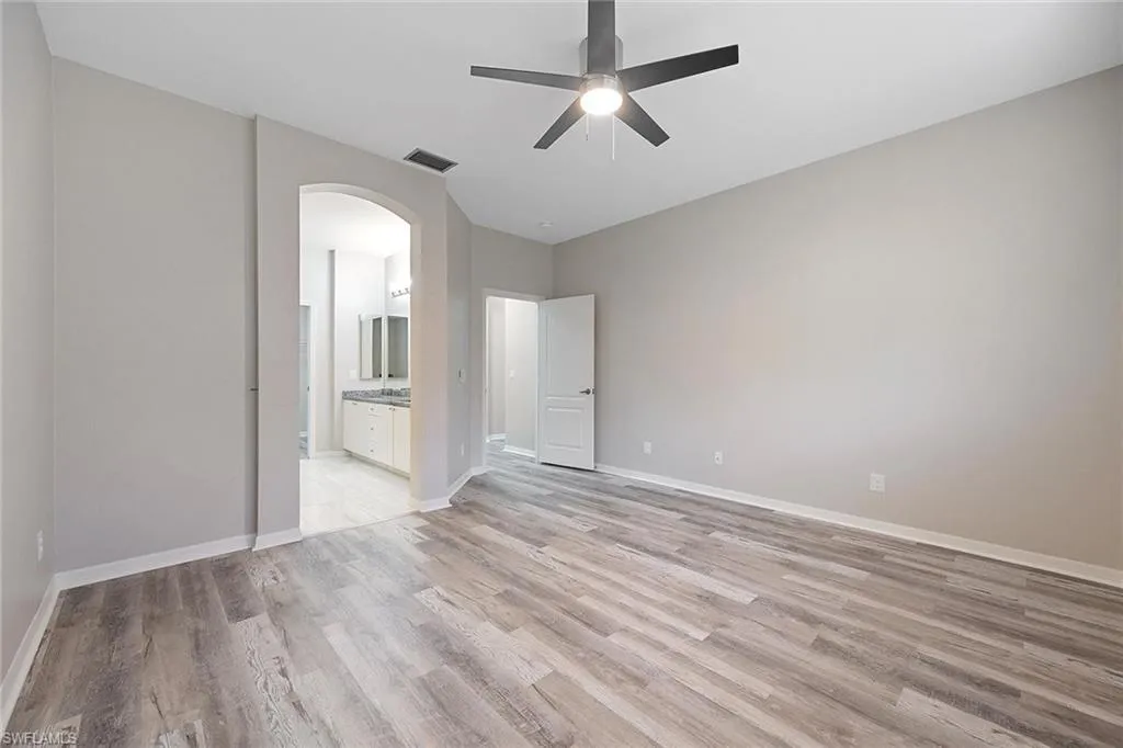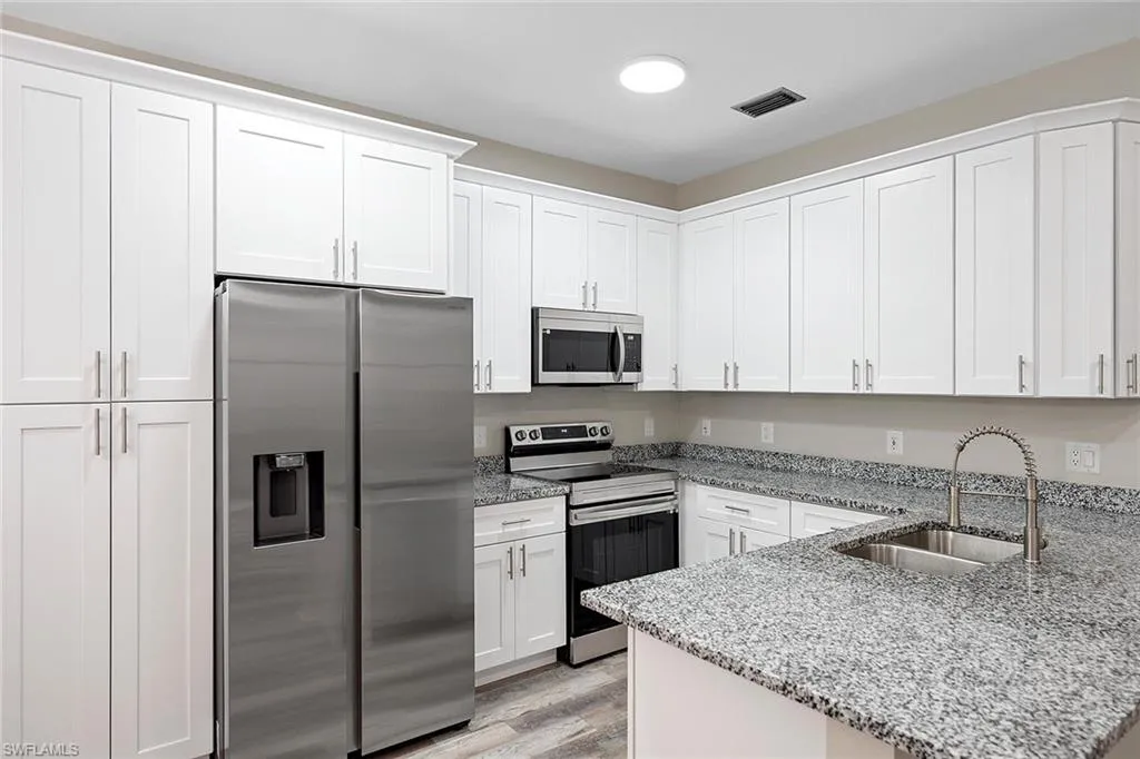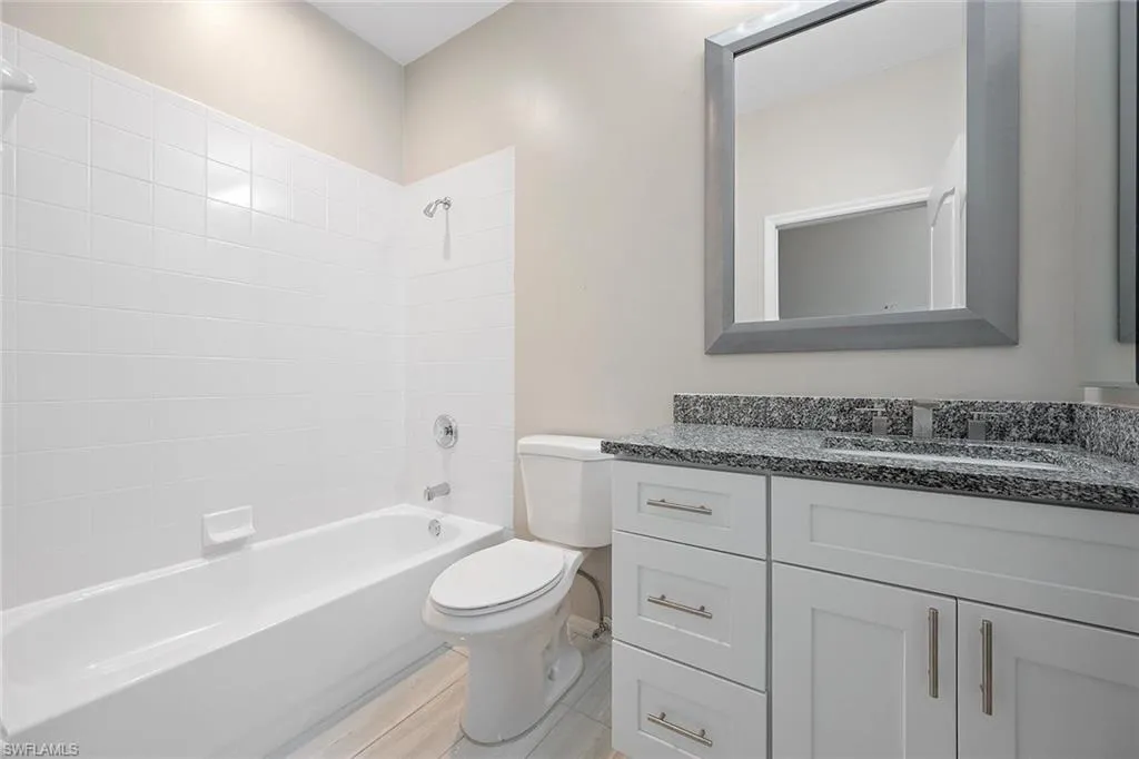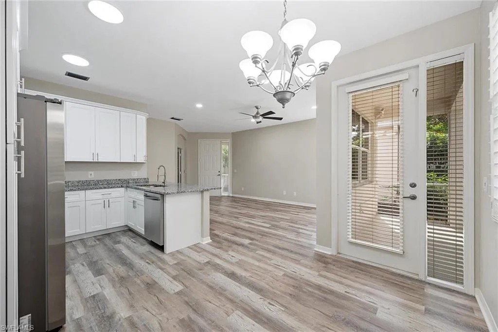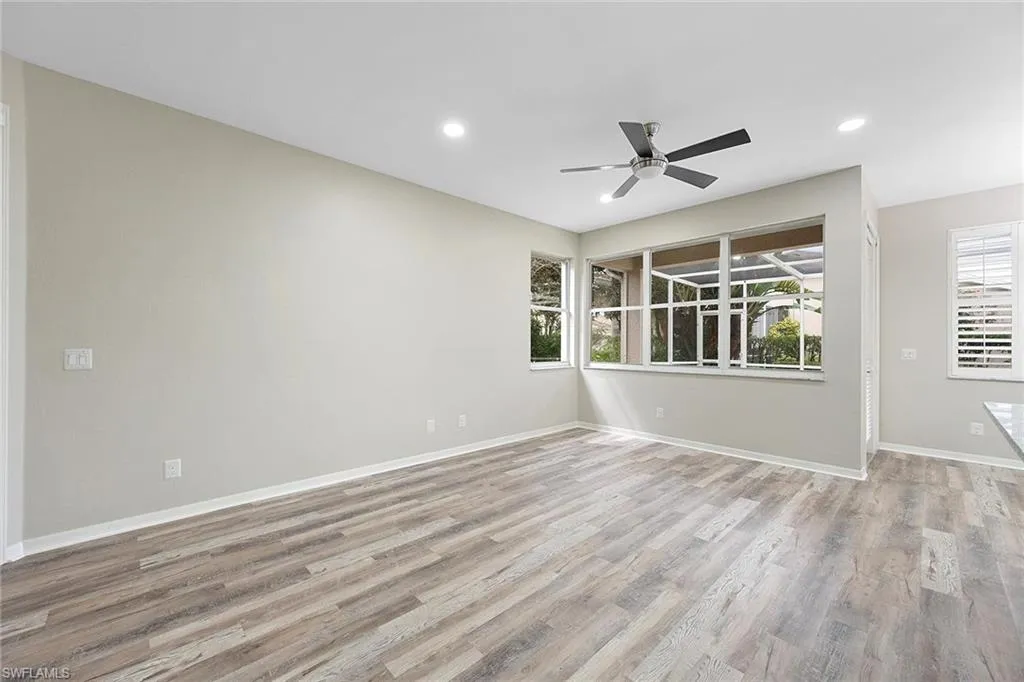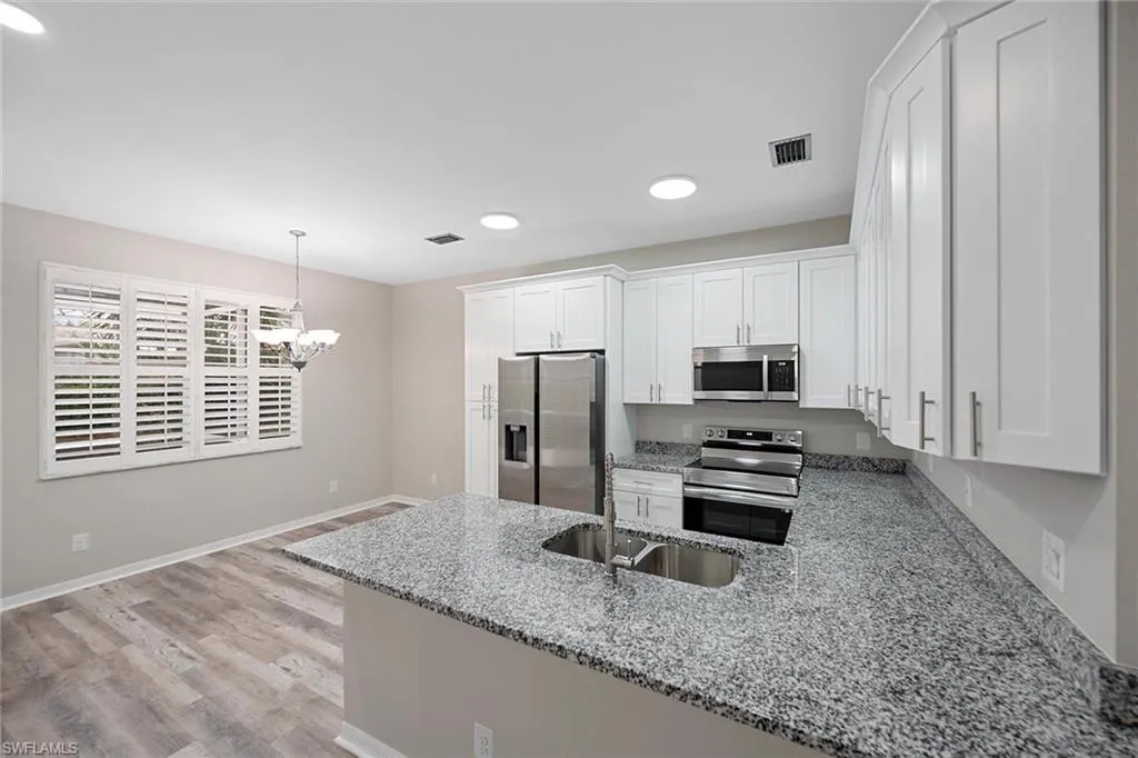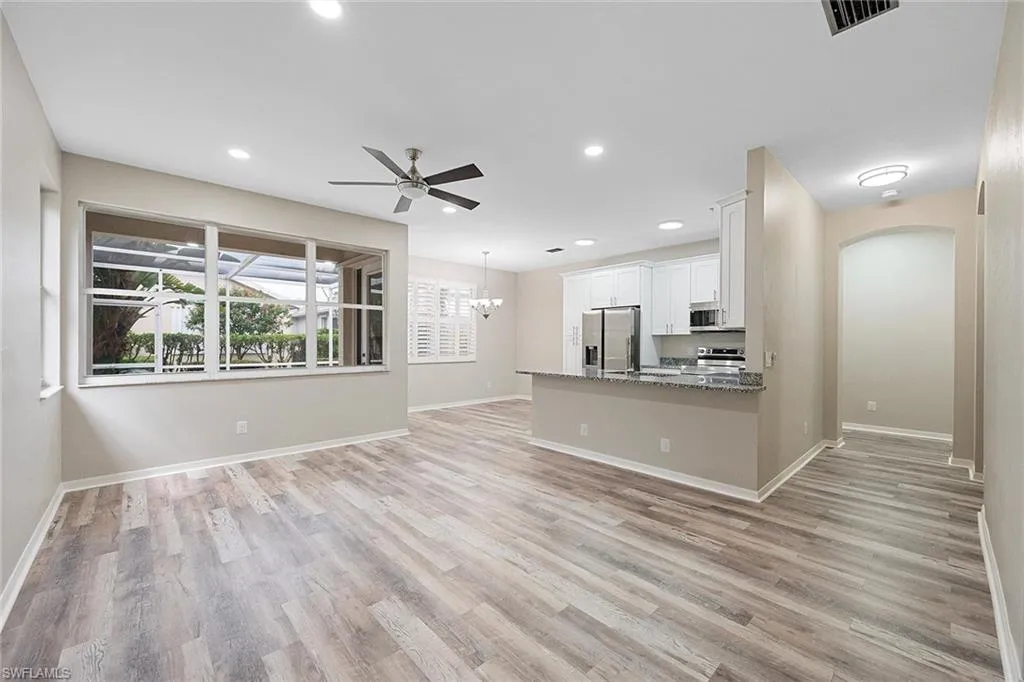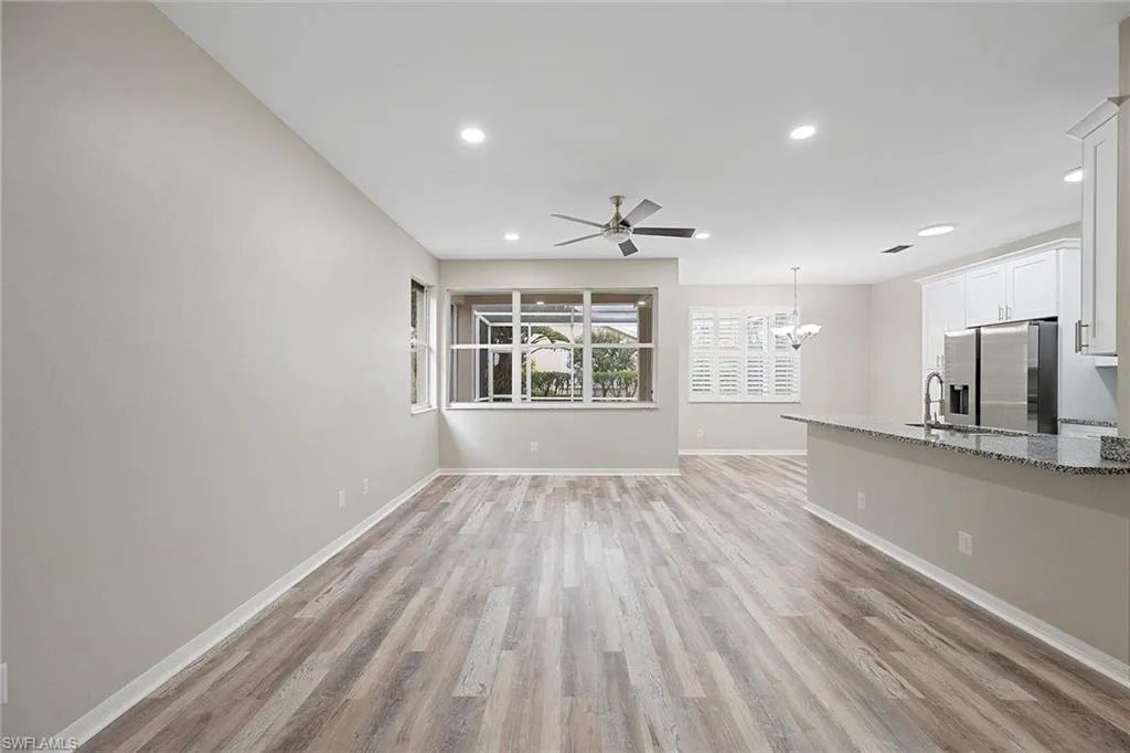 Beautifully remodeled in 2023, this three-bedroom, two-bath single-family home showcases thoughtful updates, including wood-look tile flooring, plantation shutters, epoxy-coated garage floors and an electric vehicle charger. This beautifully updated kitchen blends style and functionality with sleek cabinetry and gleaming stainless steel appliances. The open layout creates seamless flow into dining area and living areas. Perfect for everyday living and entertaining alike. The primary suite features a walk-in closet and a beautifully updated bath with dual sinks and walk-in shower. A brand-new A/C system (August 2025) adds peace of mind. Outdoor living shines on the screened lanai with both covered and open areas for relaxing or entertaining. The Villages of Bonita Springs offers resort-style amenities, including a clubhouse, pool and spa, fitness center, billiards, shuffleboard, and tennis courts that convert to pickleball, along with year-round social activities. The HOA provides roof replacement every 15 years, included in fees. Conveniently located near downtown Bonita Springs and Coconut Point Mall.