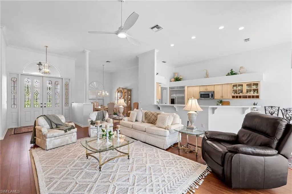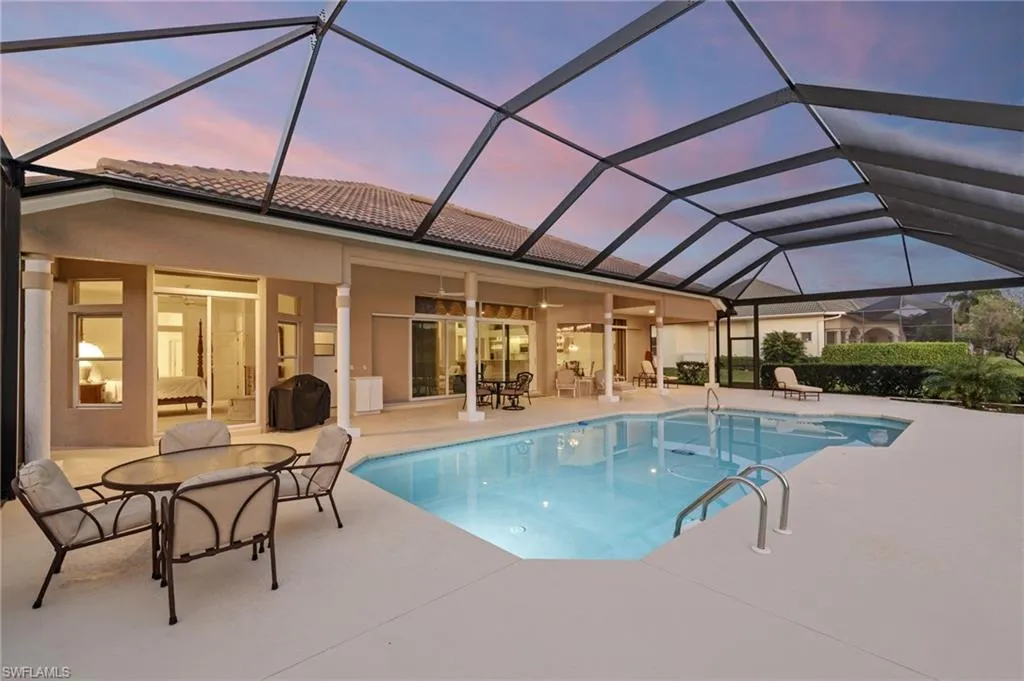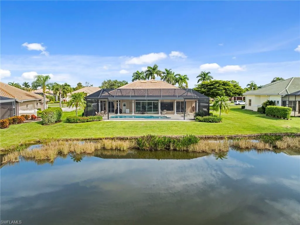 Embrace the beauty of country club living surrounded by nature in this meticulously cared-for home offering a stunning water view in Wildcat Run Golf & Country Club. Set on a nearly half-acre lot, this 3-bedroom, 3-bath residence spans approximately 2,215 sq ft of bright, open living with soaring volume ceilings, light neutral paint, and a circular driveway leading to an oversized 2-car garage. Recent updates elevate both style and peace of mind, including a new tile roof, brand-new impact-resistant sliders, and a new panoramic pool screen. The great room flows effortlessly to the dining area, built-in bar, and kitchen with a sunny breakfast nook, opening to an oversized covered lanai overlooking the sparkling pool, shimmering lake, and manicured fairway beyond. The home’s southwest orientation fills the interior with natural light throughout the day and showcases breathtaking sunset skies over the pool and lanai each evening. The primary suite provides direct lanai access, dual vanities, a garden tub, oversized walk-in shower, and a spacious walk-in closet. Two guest bedrooms provide flexibility for visitors or a home office, complemented by a shared full bath and a separate full pool bath offering convenient lanai access. Nestled among sprawling home sites, custom-built residences, and lush, mature landscaping, Wildcat Run offers a truly distinctive setting. Residents enjoy an Arnold Palmer–designed 18-hole championship course (with no waitlist for golf memberships), tennis and pickleball courts, bocce, fitness and wellness facilities, casual and fine dining, and a busy year-round social calendar—all just minutes from I-75, RSW Airport, Coconut Point, Hertz Arena, fine dining, shopping, and the beautiful Gulf beaches.