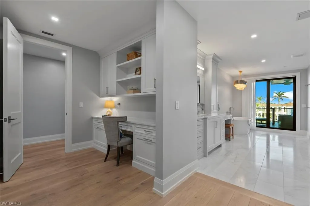 The primary suite is a serene retreat with a spa-inspired bath and terrace access, while three additional ensuite bedrooms provide comfort and privacy. A sophisticated office/den captures sweeping Gulf views, creating an inspiring setting to work or unwind.