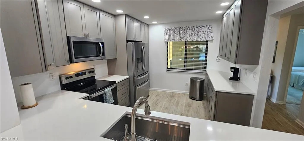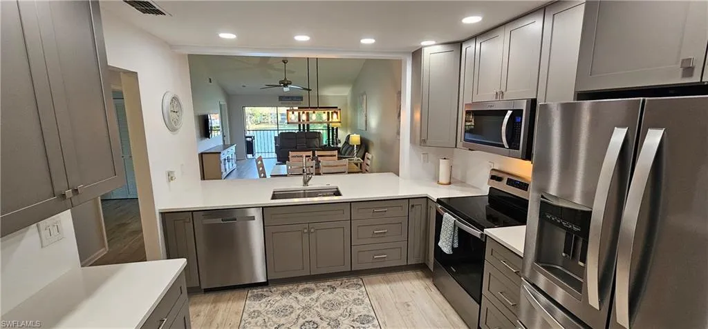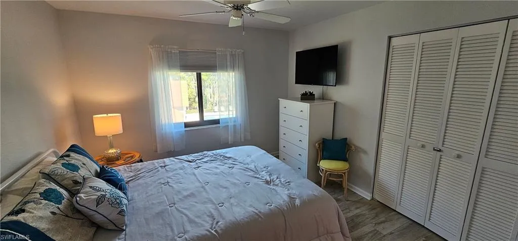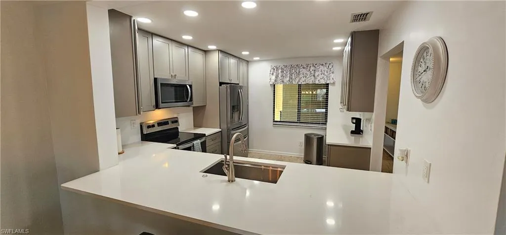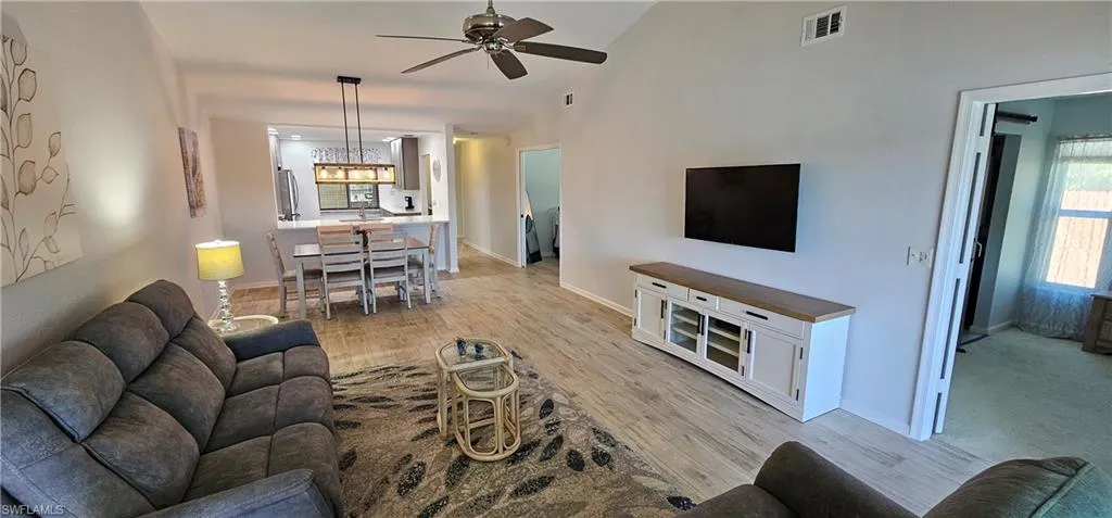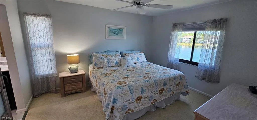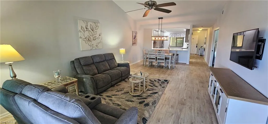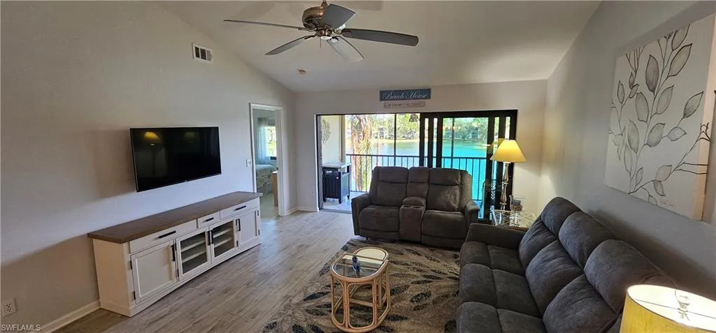 Enjoy living the southwest Florida lifestyle in this fabulously updated 3 bedroom 2 bath corner unit condo on the top floor with a stunning and expansive lakeview. Relax and unwind on your private screened lanai and watch the fish jump in the lake just outside. This 3rd and top floor home provides the new owner with peace of mind and comfort that there will be no noisy neighbors above you and boasts plank style tile flooring and high ceilings throughout the main living areas which provide an open and spacious feel to the home. The updated kitchen looks out over the main living area so you don’t miss any of the action and features stainless steel appliances and quartz counters. The roomy master bedroom suite features an updated private bath with a large tiled walk in shower and spacious walk in closet. There are 2 guest bedrooms perfect for hosting company or turn one of them into an office or den. Discover the charm of Deauville Lake Club which is ideally located just minutes to downtown, 5th Avenue shopping and dining and some of the finest beaches in Naples. Deauville offers 2 clubhouses, 2 pools, a spa, grills, tennis courts, shuffleboard and in a park-like peaceful setting with picnic areas and benches to sit and enjoy nature. This active community and membership offers dancing, water aerobics, bingo, card games, exercise classes, and for those with a creative flair, the philanthropic artist group offers a chance to indulge in artistic pursuits while contributing to the community. Recent updates have further enhanced the living experience at Deauville as the buildings now boast impact-resistant windows and sliders, new roofs, carports, and freshly painted exteriors. The modernized smoke alarms ensure safety, while the inclusion of cable and Wi-Fi in the HOA dues adds to the convenience of residents including poolside Wi-Fi.