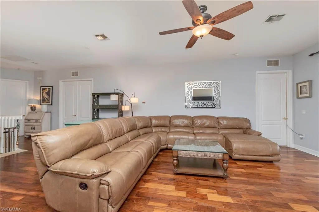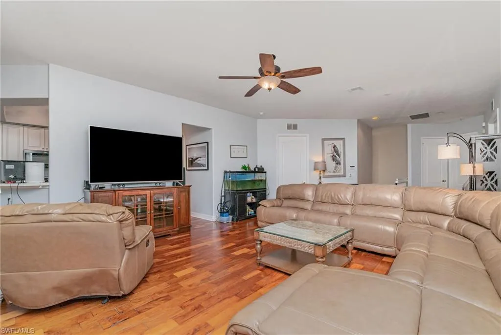 Welcome to your dream coach home within a gated community—a perfect blend of comfort and convenience! This spacious 3-bedroom plus den, 2-bathroom retreat with over 2000 sq. ft. of living space features hardwood flooring throughout the main living area, providing both elegance and easy maintenance. Step into the expansive great room, where natural light pours in, creating an inviting atmosphere that is perfect for entertaining guests or enjoying quiet family times. The heart of this home extends to a charming, screened lanai, ideal for soaking up the sun or unwinding with a good book in the evening breeze. The thoughtfully designed layout includes a well-equipped laundry room, ensuring all your daily chores are a breeze. With 12 ft. volume ceilings soaring above, each room feels open and airy, enhancing the overall sense of space. Storm Smart Electric Roll-down Hurricane Shutter in the covered oversized lanai area and hurricane accordion shutters on all windows provide peace of mind and protection. You’ll love the convenience of an attached 2-car garage, complete with an auto garage door for easy access. New Roofs in 2024 and newer AC unit only 2 years old. Located within walking distance to the clubhouse, you’ll have access to a myriad of amenities that make everyday living a joy. Enjoy sunny days by the community pool, relax in the spa, or keep fit in the exercise room—all just moments from your front door. With its superb location near shopping, dining, and recreation, this coach home offers not just a place to live, but a vibrant lifestyle. The HOA fees include cable, Internet, water, exterior maintenance and insurance. Don’t miss this opportunity to embrace a beautifully balanced life in a community designed for leisure and enjoyment!