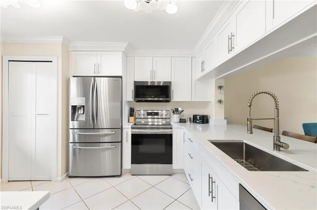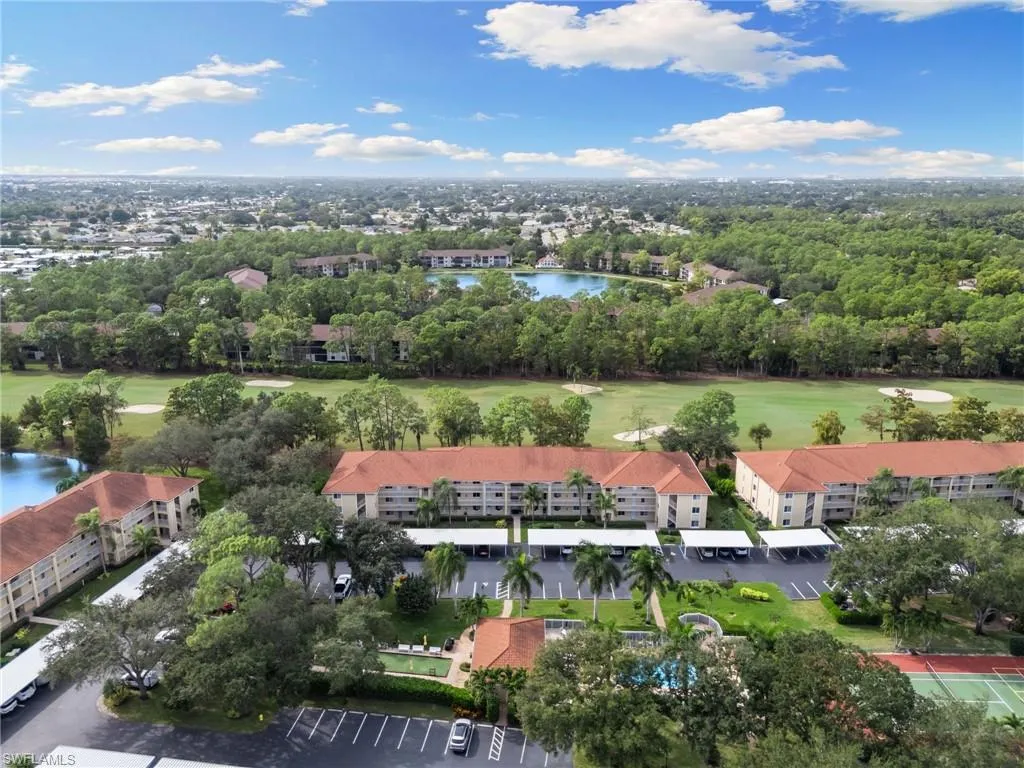 Welcome to Amberly Village in Royal Wood Golf & Country Club, an exceptionally located community central to everything you could want in a South Florida lifestyle. This is a rare, bundled golf community, only 5-6 miles from 5th Avenue, world class dining and shopping, the Naples Pier and our pristine beaches. This charming, updated condo features tile floors throughout, a beautifully appointed kitchen with custom cabinets, Quartz countertops, stainless steel appliances, and abundant storage. The 2 bedroom, 2 full bath layout is spacious and comfortable, while the 2nd floor location and west-facing screened balcony provides pretty views of the 14th fairway and the sunset, with the additional peace-of-mind that you’re safe from any storm flood waters. The water heater and A/C were new in 2024 and in the laundry room you will find plenty of extra storage and a 2024 set of front-loading washer & dryer. Full golf and social memberships are yours as soon as you close, no wait-list, and amenities and activities abound. Amberly Village features a pool, spa, tennis/pickleball court and bocce for its residents, but if you’re looking for a more social atmosphere, just head down to the Royal Wood clubhouse. There you will find a restaurant and bar, fitness center, racquet courts, library, pro-shop and all sorts of social activities, dances, trivia and more, and of course men’s and lady’s golf events on the Championship 18 hole course. When you do need to leave the community, all the needs of everyday life can be met with just a short drive…grocery stores, home improvement, medical needs and even more amusing things like Tin City, Celebration (food-truck) Park, the Botanical Gardens, the now famous Naples Pickleball Center and even beach, boating and water activities on Marco Island. Royal Wood is a great community for golfers and non-golfers alike, but with fewer and fewer public golf options and the sky-rocketing costs of private golf clubs, Royal Wood is a fantastic value. What are you waiting for? Start living and playing in Naples today!