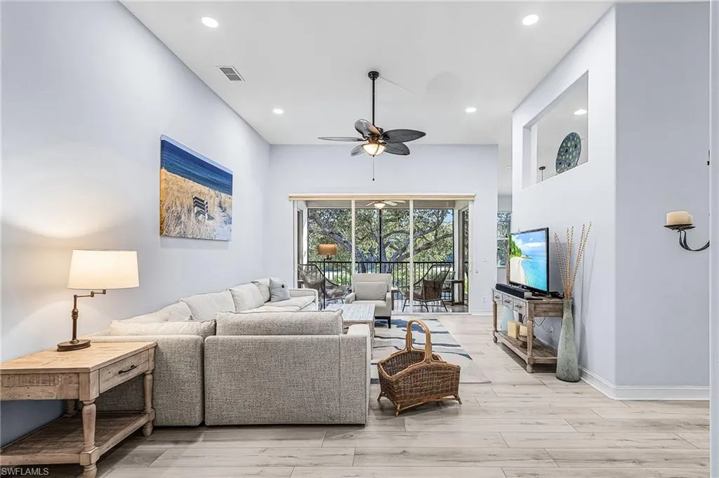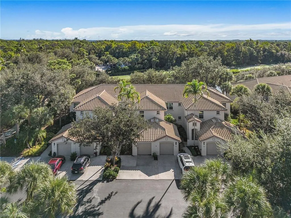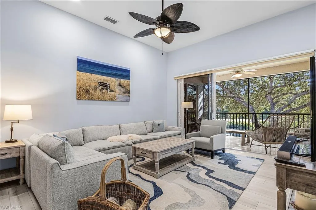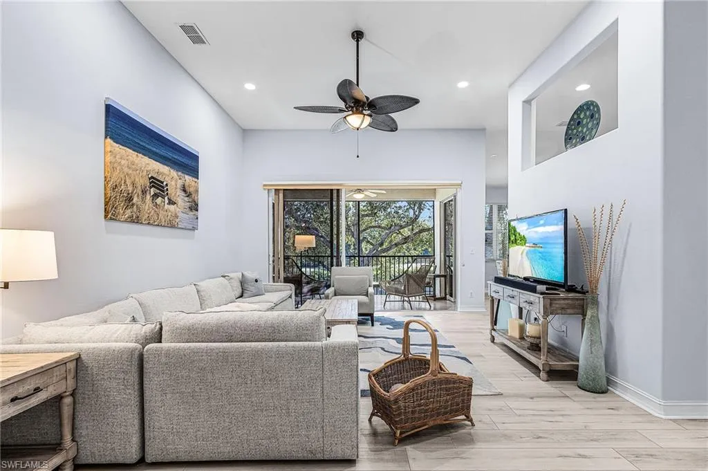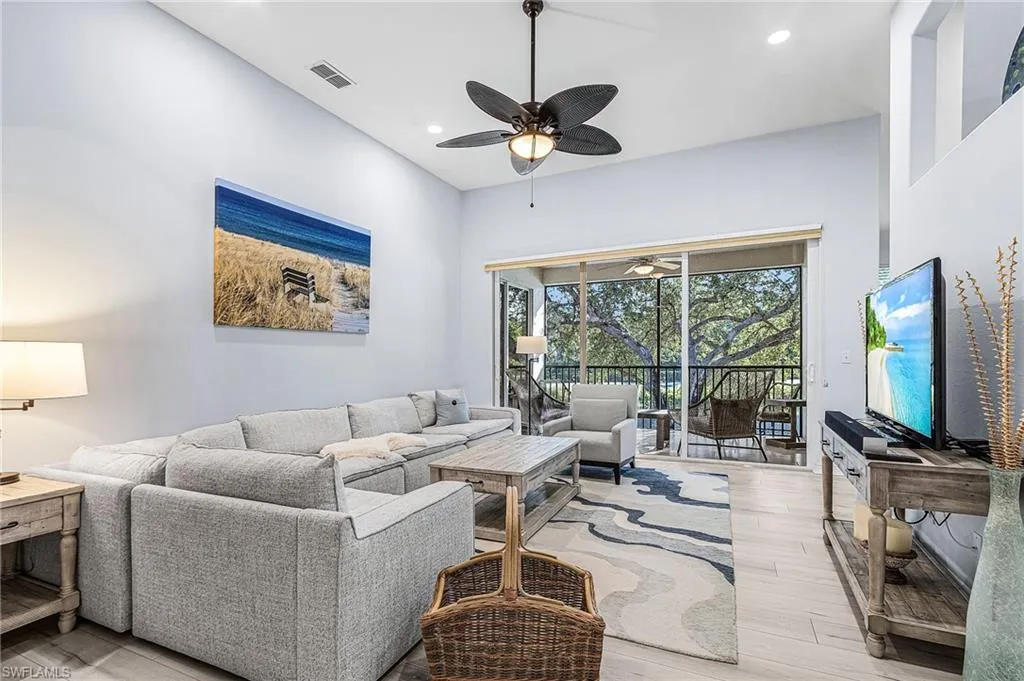 Step into this pristine second-floor coach home in Pelican Sound, one of Southwest Florida’s top bundled golf communities. Offered turnkey furnished in a fresh coastal style with stylish accents, this residence boasts stunning views from the lake to the first fairway of the Lakes course. The updated kitchen features sleek quartzite countertops, tall 42-inch white cabinets, crisp white appliances, and convenient pull-out drawers for easy organization. Throughout the main living areas, soaring volume ceilings enhance the sense of space, complemented by durable luxury vinyl plank flooring that runs seamlessly from room to room. Recent upgrades—such as hurricane-resistant windows and sliding doors installed in 2025, refreshed baths, modernized kitchen elements, and new flooring—ensure the entire home feels thoughtfully refreshed and contemporary. Relax in the tranquil primary suite, which includes a tray ceiling, direct lanai access, and a spacious walk-in closet. The fully renovated primary bath offers a long vanity with dual sinks, an updated tiled shower, and a seamless shower door. For guests, a pocket door provides privacy along the hallway to the guest bedroom and its adjacent bath, which has been updated with a new vanity and quartzite countertop. The versatile third bedroom, with double doors, currently serves as a home office or den. Outside, park your car or golf cart in the one-car garage, with additional pads for two more vehicles and nearby guest parking. Access your private entrance via a dedicated stairwell, and enjoy the bright east-facing exposure that fills the space with morning light. Conveniently located near the Corkscrew Road gate, this lightly used vacation condo remains in exceptional condition—simply unpack and settle in! For an active lifestyle, Pelican Sound offers 27 holes of championship golf, 14 pickleball courts, 8 tennis courts, and 6 bocce areas, plus a state-of-the-art fitness center with professional staff. Bordering the Estero River with Gulf access, the community provides secure dry boat storage, kayaks, canoes, and paddleboards. A standout feature is the shuttle service—a scenic pontoon boat ride through Estero Bay to Lovers Key State Park Beach, perfect for spotting wildlife and soaking in breathtaking views. Residents also enjoy the clubhouse with exceptional dining options right in the neighborhood, so you never need to venture far for a memorable meal. Just moments from RSW International Airport, Coconut Point, and an array of shopping and restaurants, this is the ultimate spot to live the Florida dream!