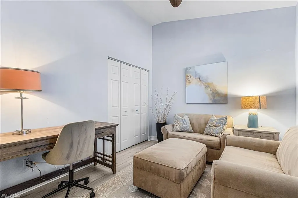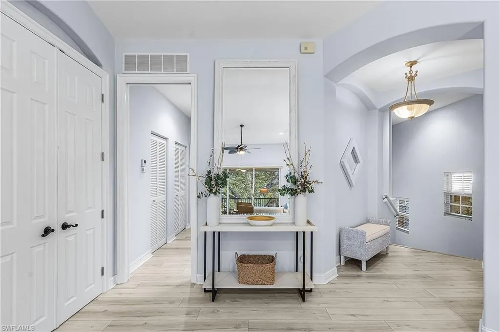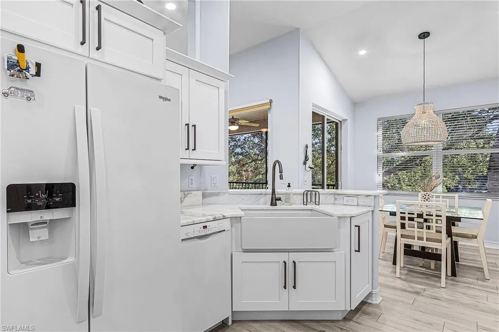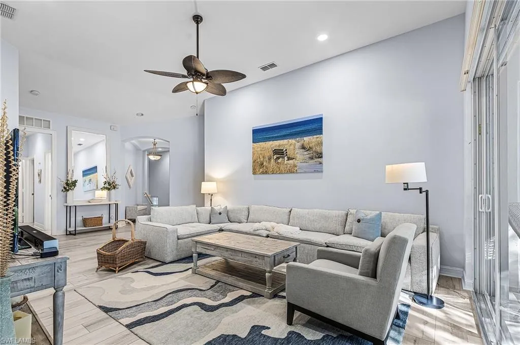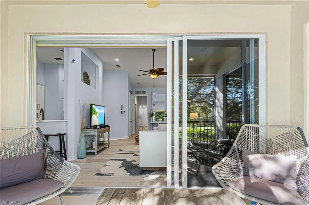 Step into this pristine second-floor coach home in Pelican Sound, one of Southwest Florida’s top bundled golf communities. Offered turnkey furnished in a fresh coastal style with stylish accents, this residence boasts stunning views from the lake to the first fairway of the Lakes course. The updated kitchen features sleek quartzite countertops, tall 42-inch white cabinets, crisp white appliances, and convenient pull-out drawers for easy organization. Throughout the main living areas, soaring volume ceilings enhance the sense of space, complemented by durable luxury vinyl plank flooring that runs seamlessly from room to room. Recent upgrades—such as hurricane-resistant windows and sliding doors installed in 2025, refreshed baths, modernized kitchen elements, and new flooring—ensure the entire home feels thoughtfully refreshed and contemporary. Relax in the tranquil primary suite, which includes a tray ceiling, direct lanai access, and a spacious walk-in closet. The fully renovated primary bath offers a long vanity with dual sinks, an updated tiled shower, and a seamless shower door. For guests, a pocket door provides privacy along the hallway to the guest bedroom and its adjacent bath, which has been updated with a new vanity and quartzite countertop. The versatile third bedroom, with double doors, currently serves as a home office or den. Outside, park your car or golf cart in the one-car garage, with additional pads for two more vehicles and nearby guest parking. Access your private entrance via a dedicated stairwell, and enjoy the bright east-facing exposure that fills the space with morning light. Conveniently located near the Corkscrew Road gate, this lightly used vacation condo remains in exceptional condition—simply unpack and settle in! For an active lifestyle, Pelican Sound offers 27 holes of championship golf, 14 pickleball courts, 8 tennis courts, and 6 bocce areas, plus a state-of-the-art fitness center with professional staff. Bordering the Estero River with Gulf access, the community provides secure dry boat storage, kayaks, canoes, and paddleboards. A standout feature is the shuttle service—a scenic pontoon boat ride through Estero Bay to Lovers Key State Park Beach, perfect for spotting wildlife and soaking in breathtaking views. Residents also enjoy the clubhouse with exceptional dining options right in the neighborhood, so you never need to venture far for a memorable meal. Just moments from RSW International Airport, Coconut Point, and an array of shopping and restaurants, this is the ultimate spot to live the Florida dream!
