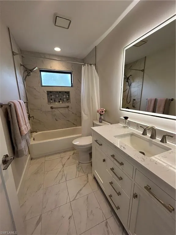 Beautifully renovated Island Park Village Villa ready for immediate occupancy. Spacious 2 bedrooms, 2 baths with 1202 sq ft under air; new fixtures, new fans, fresh paint throughout, new kitchen cabinets & quartz counter top, new stainless kitchen appliances and laundry appliances; walk in closet in primary bedroom. Views of preserve area, extended screen front & back screened lanai. Enjoy the community pool & spa. Single car garage, and amenities access included. Fantastic location near I-75, Gulf Coast Town Center and Gulf Coast University. This is NOT a 55+ HOA. LOWEST HOA dues in the community.