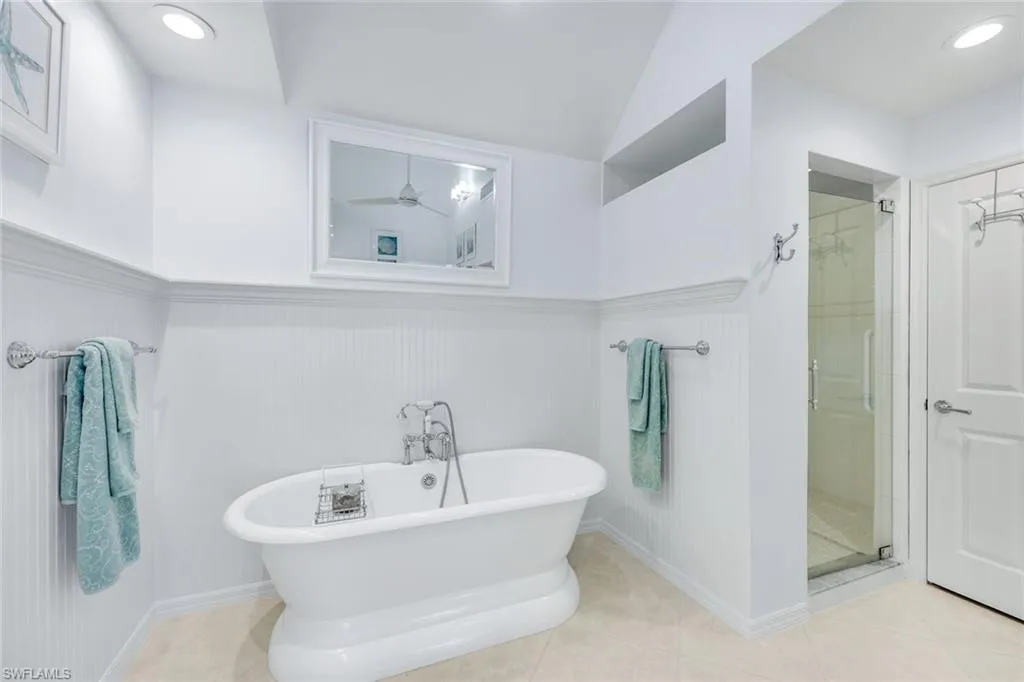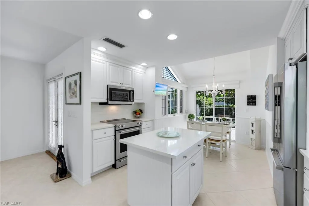 Nestled in the prestigious Bridge Way Villas enclave of Pelican Bay, this exquisite single story lakefront villa is a true haven for those who cherish stunning views and outdoor living. Experience the very best of Naples’ upscale coastal lifestyle with a tranquil oasis designed for relaxation and entertaining. The heart of this home is its spectacular outdoor space, where a very spacious covered lanai overlooks a large pool deck and a custom free-form pool with a built-in cascading water fountain. This is a private sanctuary for sun-soaked afternoons and quiet evenings. The coveted western exposure provides this home with gorgeous sunset skies that paint the tranquil lake and fountain view with vibrant color every evening. You will love that these exceptional, breathtaking views are featured from the main living area, spacious living room, and the master bedroom. The interior of this beautifully maintained 3-bedroom, 2.5-bath residence provides 2,100 square feet of extraordinary living space in this single story home with no steps to navigate. The home features an open-concept layout with soaring 20-foot vaulted ceilings, electric fireplace to enjoin the winter months and a magnificent kitchen with stainless steel appliances including a new range and microwave, quartz countertops, and a morning room. Master bath is a relaxing retreat with a walk- in shower, a freestanding soaking tub and walk in closet. Recent updates include a new roof in 2021, new washer and dryer and new air-conditioning to the two-car garage. Living here grants access to all Pelican Bay privileges, including nearly three miles of private white-sand beaches, beachfront dining at two private restaurants, tennis and pickleball courts, a fitness center, walking trails, and kayaking. The villa is located on a quiet cul-de-sac and is a short walk to Waterside Shops and Artis-Naples.