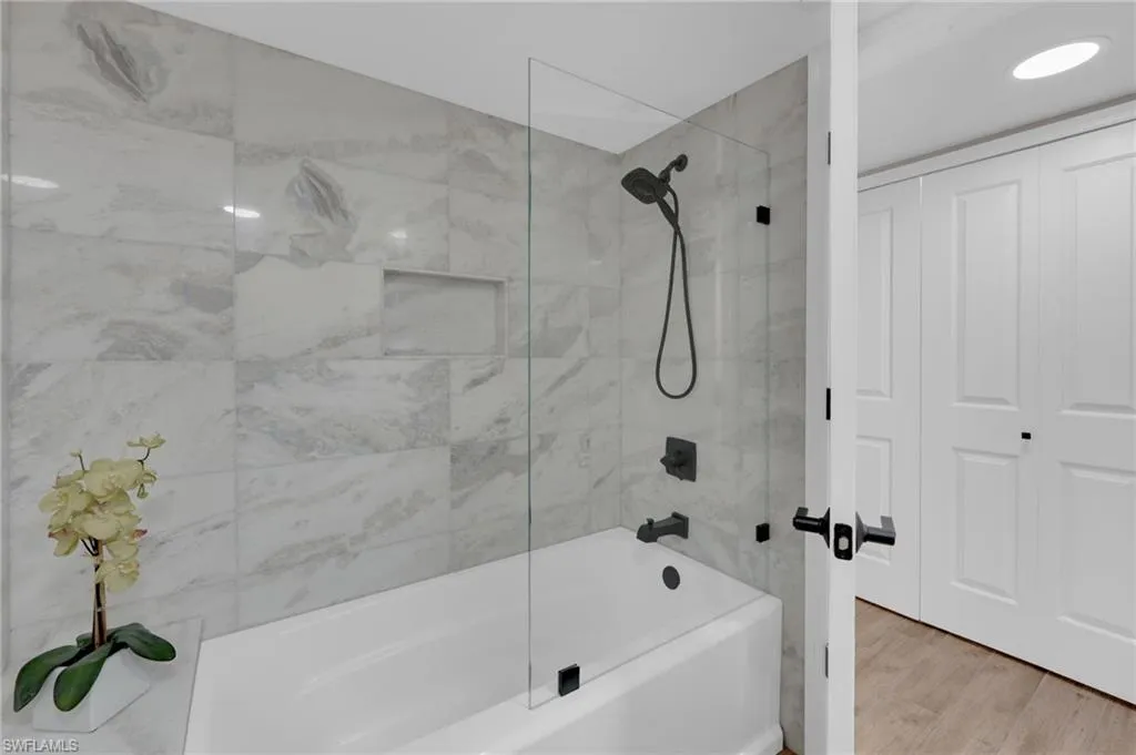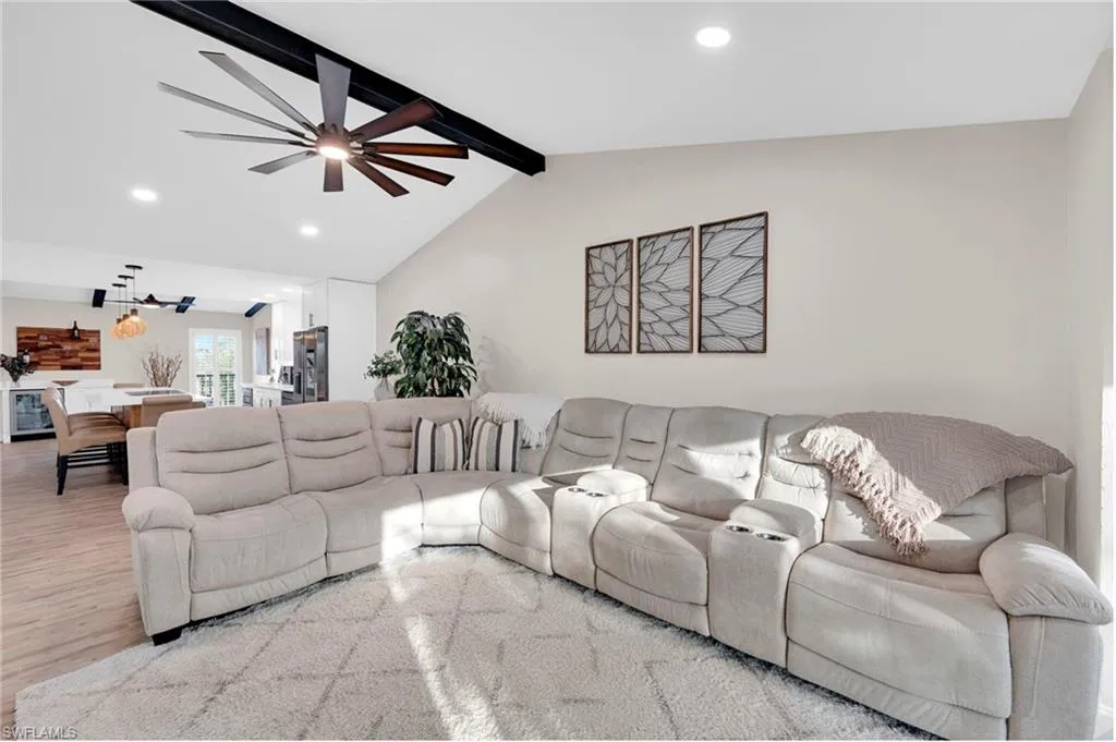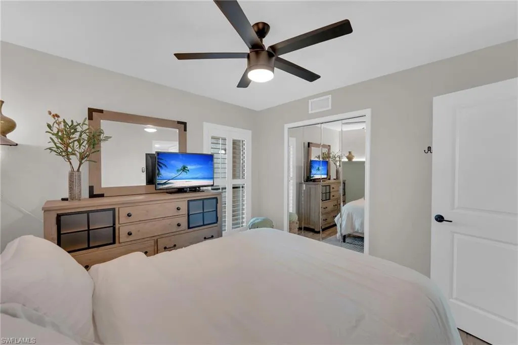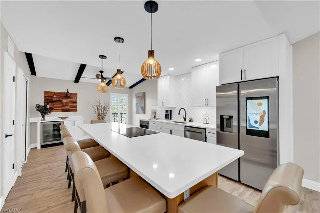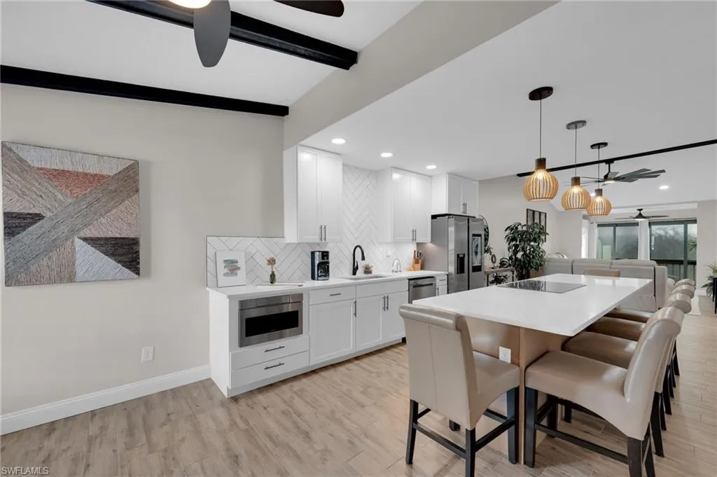 Welcome to paradise living at Windward Way Condos in Fort Myers! This BEAUTIFULLY REMODELED TOP FLOOR END-UNIT offers modern comfort and coastal charm just minutes from Fort Myers Beach and Sanibel Island. Featuring two bedrooms, two full bathrooms, and a versatile sunroom with a Murphy bed, this FULLY FURNISHED condo is ideal for full-time living, a seasonal getaway, or a rental investment—with NO RENTAL RESTRICTIONS. Windward Way condos are VERY RARELY AVAILABLE. The interior showcases quartz countertops, a massive island, modern stainless steel appliances, soft-close cabinetry, under-cabinet lighting, and an extra wine refrigerator in the kitchen. The great room’s vaulted ceiling, plantation shutters, and ceramic tile flooring create an open, airy feel. Enjoy sunset and water-fountain views from the southwest-facing sunroom sliders or gather with friends on your oversized private front porch. The primary suite features a marble tile shower with frameless glass door, while the guest bath includes a marble tile surround and tub. Additional highlights include impact-rated sliders, five high quality ceiling fans all with dimmable lights, and a newer washer and dryer in-unit. Recent updates provide peace of mind: a 2025 water heater and a 2023 AC handler and condenser. The building’s 10-year milestone inspection has been successfully completed and the community has received all new landscaping. Residents enjoy a community pool, spa, pickleball and tennis courts, shuffleboard, water-fountain pond, and ample guest parking. Includes one covered carport space, a private storage closet, and bike racks. This ideal location is just minutes from the beaches and surrounded by great restaurants, shops, and local attractions—perfect for enjoying the Southwest Florida lifestyle!
