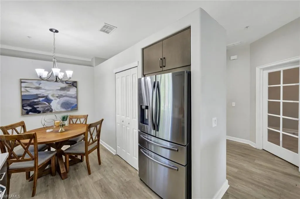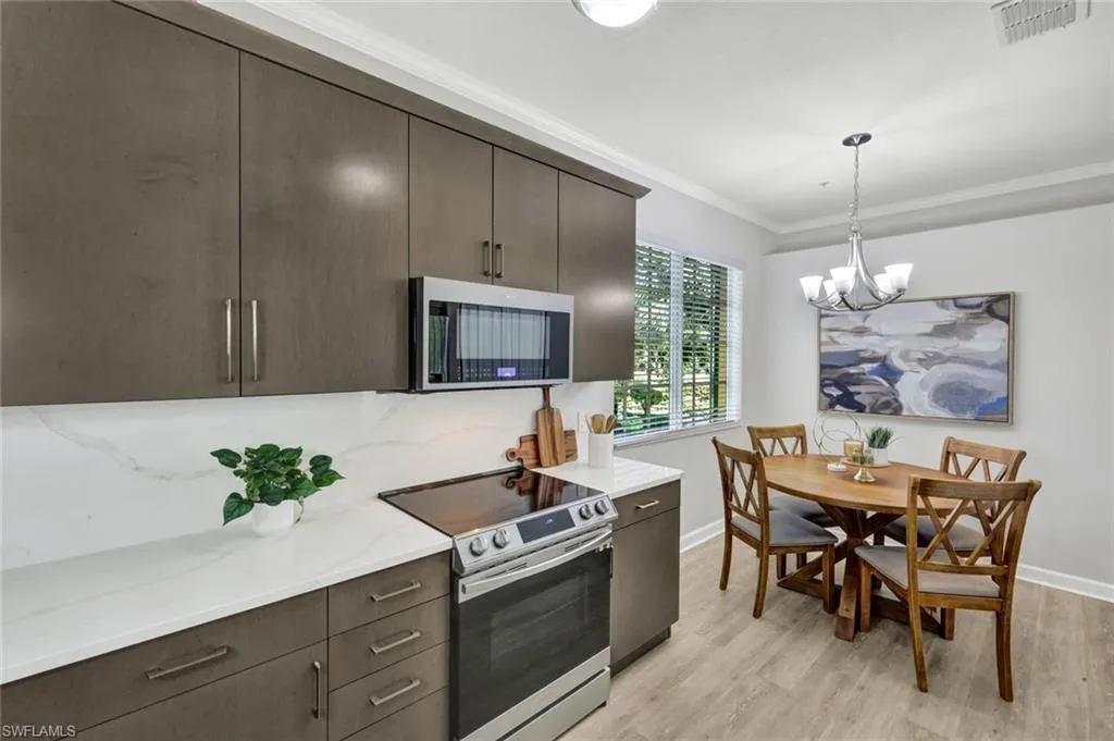 This beautifully renovated 3-bedroom, 2-bath end unit in a sought-after elevator building offers privacy and convenience — with no neighbors above or below and direct elevator access to your door. Current owners have invested over $100,000 in updates to this property, featuring a custom kitchen and bath cabinetry with pull-out storage, Quartz counters and backsplash, stainless steel appliances, new HVAC (2025), hot water heater (2024), easy-to-maintain Coretec brand LVT plank flooring, crown molding, and modern fans. The lanai overlooks a peaceful lake. Located in Rapallo at Coconut Point, an active, neighborly atmosphere with resort-style amenities including: Two lagoon-style pools with waterfalls + spa, Screened junior Olympic lap pool + two satellite pools, Clubhouse with catering kitchen, library & social spaces, 5 Har-Tru tennis courts with on-site pro, Full-time activity & fitness directors, saunas, bocce, walking/bike paths, and lush gardens. Rapallo is perfect for someone who loves an active, social lifestyle and values convenience and connection. This property is located in a vibrant environment where you can walk to dining, shopping, and entertainment, enjoying the energy of the community right outside the door.