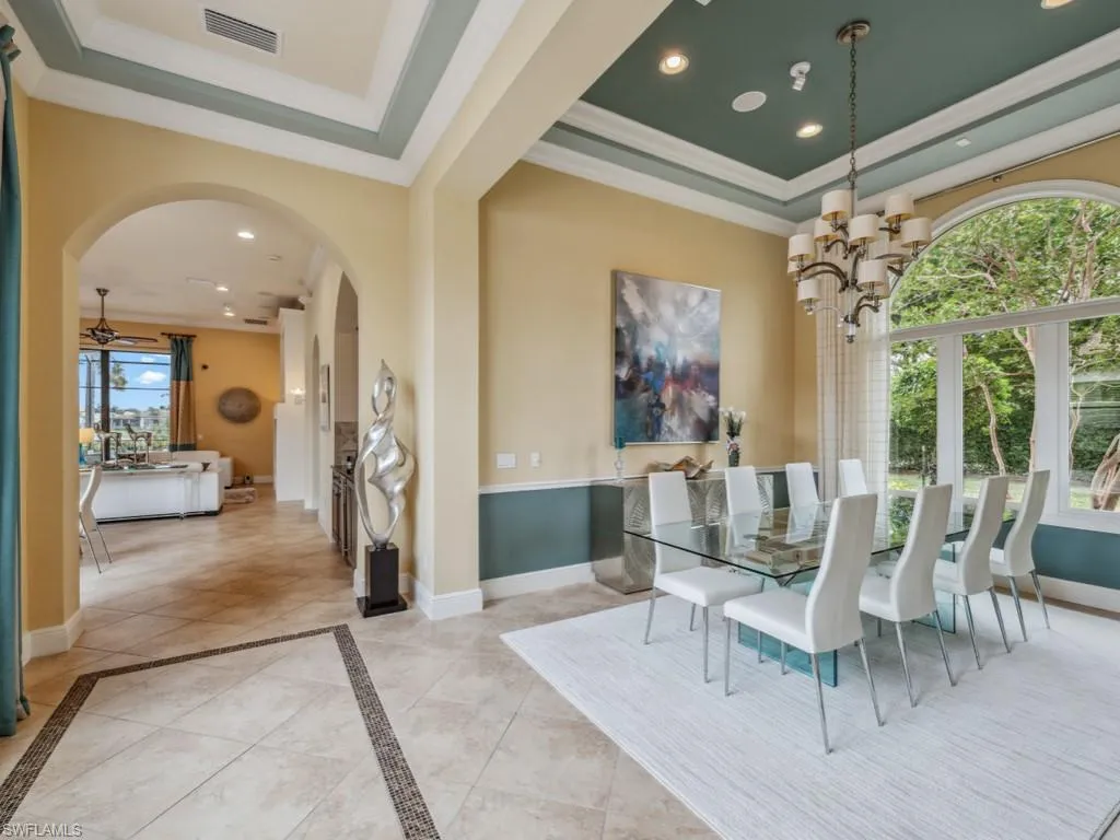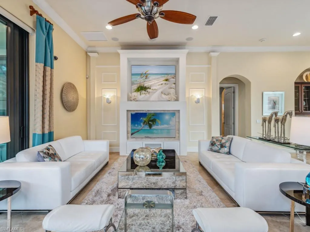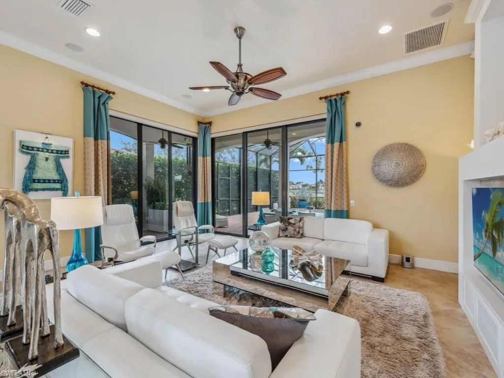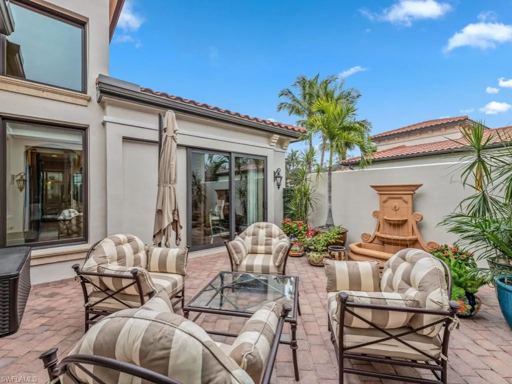 Located in the beautiful Mediterra Golf & Country Club of Naples that offers a newly renovated private beach club for residents – This stunning home combines refined architecture with modern luxury, starting with the striking curb appeal with lush landscaping, lakes with fountains both in front and behind the house, and the spacious paver driveway, which leads past iron gates and stone-accented pillars into a private courtyard entry. The foyer emphasizes an open and welcoming atmosphere with soaring ceilings, arched passageways, and gentle, neutral tones. The sunlit den is located just beyond the foyer, which functions as a private office with courtyard access through tall sliding doors. The formal dining room exudes style & sophistication with a beautiful glass table and tasteful contemporary décor. The main living areas accommodate open-concept design, allowing seamless flow between spaces, incorporating modern design elements, stylish furniture, and abundant natural lighting through the wall of tall glass sliding doors connecting the Living and outdoor spaces. The Gourmet kitchen is full of light with a private courtyard adjacent and features a walk-in pantry, premium Monogram appliances, beautiful wood cabinetry, granite countertops wrapped around the gas cooktop, double wall ovens, and a breakfast bar. Just a few steps from the kitchen is a convenient bar with its own wine cooler, perfect for entertaining. The primary suite is indulgent, with two walk-in closets, private outdoor access, a quiet sitting area, and a spa-inspired bath equipped with a separate tub & shower, dual vanities, modern fixtures, and tasteful finishes. The guest bedrooms are spacious and well-appointed, with contemporary décor, large windows, and en-suite bathrooms. The large screened outdoor area is the perfect gathering space to soak in those sunny days. A generous-sized pool & spa are the centerpiece. It includes an outdoor kitchen, dining space, and lounge seating, creating a perfect oasis for relaxation & entertainment with the delightful backdrop of vibrant landscaping and a sparkling lake in the backyard. Mediterra is a prestigious luxury golf & country club community featuring Two championship Tom-Fazio golf courses for avid golfers, multiple tennis courts, pickle-ball & bocce, fitness center, pristine bike & jogging trails, and luxurious dining at the private country club restaurant. The Mediterra Beach Club offers an escape to a 10,000 sq. ft two-story private oceanfront paradise on the Gulf of Mexico. Featuring a restaurant & bar that serves members via indoor & outdoor dining, this private facility boasts a heated swimming pool, a sundeck, and cabana beach service for chairs, umbrellas & refreshments.