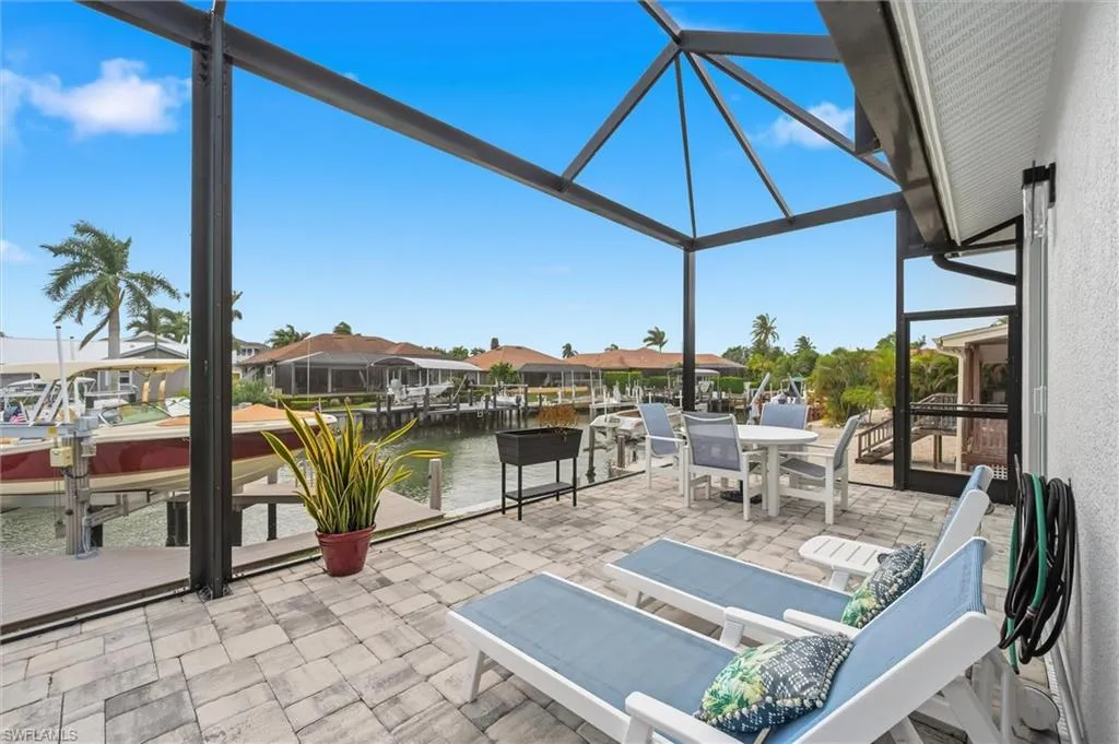 This newer, custom home, built by FCI Homes, features numerous high-end upgrades. The open-concept design includes high ceilings, a split floor plan, three bedrooms plus a den, and three full bathrooms. The kitchen is a standout, boasting quartz countertops, a large island, stainless-steel appliances, a walk-in pantry, and wood-look tile flooring throughout the main areas. The spacious great room, kitchen, and dining area offer tranquil views of the caged pool and the waterfront canal, which includes a 13,000 lb. boat lift and dock. Additional luxury features include: – Generac Generator – Impact windows – Two 10-foot sliders – An outdoor kitchen with a beverage refrigerator and covered lanai The Owner’s Suite provides comfort with two walk-in closets and separate vanities. The exterior features beautifully maintained landscaping, an oversized two-car garage, and a circular driveway. The property is ideally located just minutes from the white sand beaches of Marco Island, parks, tennis and pickleball courts, golf courses, shopping, dining, schools, and the YMCA.