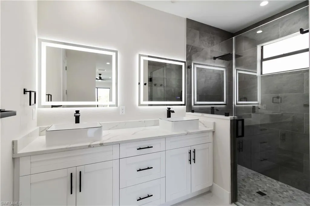 Efficient interior layout with bright, airy spaces. The master suite offers two walk-in closets with built-in wardrobes, a vanity with double sinks, LED mirrors, a walk-in shower, a private toilet, and pool views. Two additional bedrooms with built-in wardrobes share a full bathroom with a bathtub and glass door. The laundry room with an additional sink connects to the two-car garage, which has a secondary door allowing natural light in. Outside, you’ll enjoy a landscaped driveway with automatic irrigation, a paved driveway, and a beautiful front garden. A one-year builder’s warranty is included. Enjoy the Coral Oaks public golf course, the shopping area on Pine Island Road (15 minutes away), and nearby attractions such as Cape Coral Road/Sea Hawks, the Northwest Softball Complex, Matlacha Pass Aquatic Preserve, and public beaches.
