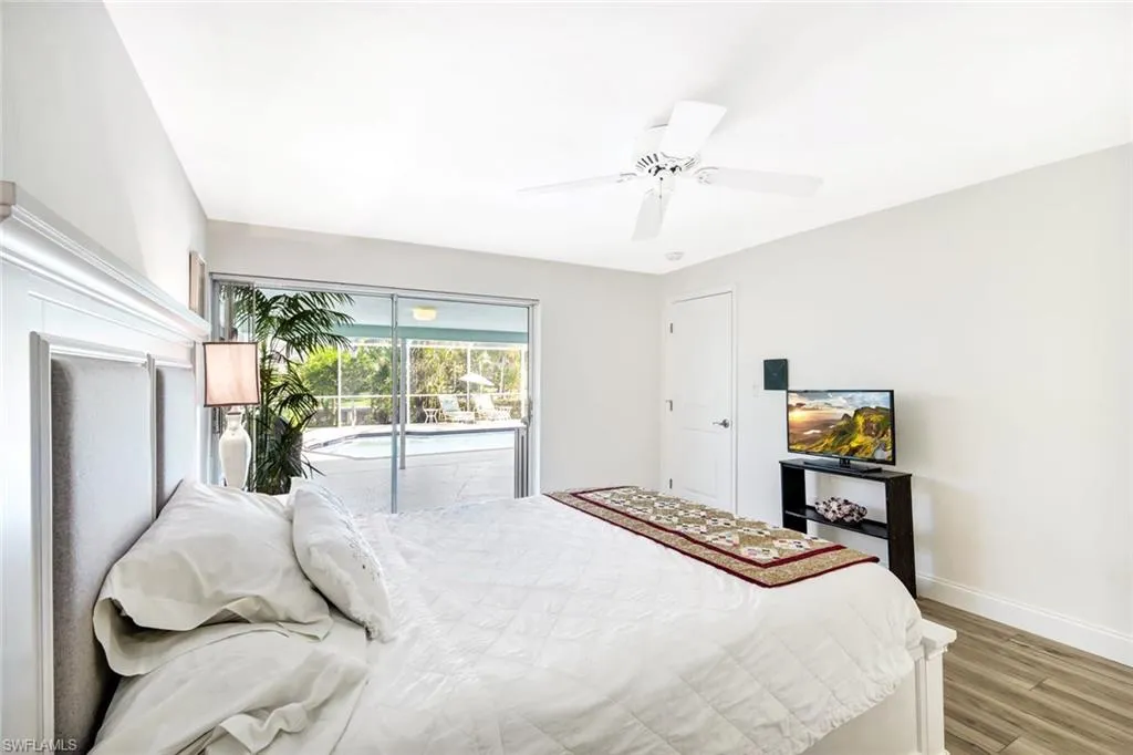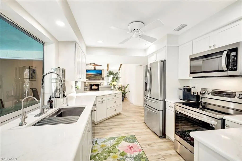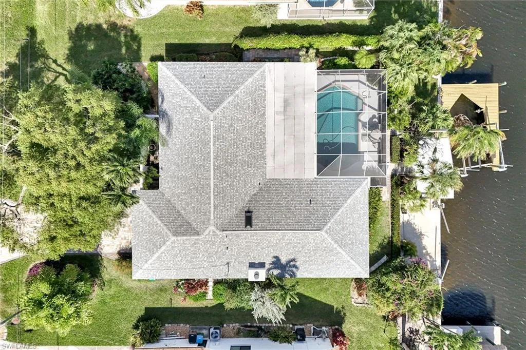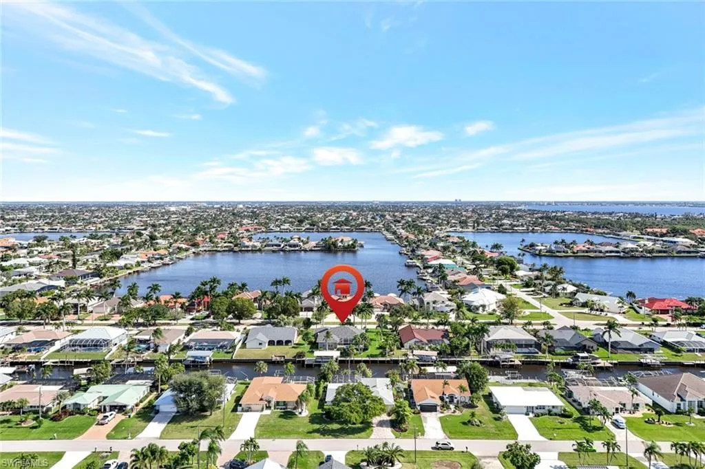 DIRECT GULF ACCESS POOL HOME IN THE HEART OF SW CAPE—NO LOCKS OR BRIDGES! Set on a quiet cul-de-sac and wrapped in lush, mature landscaping, this beautifully updated waterfront home delivers exceptional privacy, comfort, and effortless boating, offering deep water access with a 10,000-lb lift featuring brand-new motors (2025), a wraparound dock, and two davits for jet skis—all just a scenic 15-minute ride to open water. Inside, the light-filled layout showcases luxury vinyl plank flooring (2023), fresh interior paint (2023), and inviting architectural details including vaulted ceilings with exposed beams, skylights, and a custom artisan fireplace that anchors the living space with coastal charm. The remodeled kitchen features white shaker cabinetry, quartz countertops, stainless steel appliances (2024), reverse-osmosis filtration (2023), and a generous pass-through window for easy entertaining. Nearly every room opens to the expansive lanai where an oversized saltwater pool—resurfaced in 2023—sits beneath a new “no-see-um” cage (2023) with upgraded lighting, multiple seating zones, and exceptionally private sightlines created by tall palms, dense tropical plantings, and a strategic landscape design that shields the pool and lanai from neighboring views, clothing optional! The primary suite offers pool views, lanai access, and a beautifully updated bath with dual sinks, quartz counters, modern fixtures, and nautical-inspired lighting, while the guest wing includes a renovated pool bath with a custom marble shower (2023) and spacious guest rooms, one with direct pool access. **Brand NEW impact windows being installed prior to closing. Major upgrades include new HVAC and ductwork (2023), new plumbing system (2023), resealed lanai and pool deck (2024), new 50-gallon water heater (2023), new pedestal washer/dryer (2023), new paver driveway (2022), new pool vacuum (2023), and a durable 25-year shingle roof (2017). Outside, a charming bird path with arched trellises and shaded seating areas enhances the peaceful canal setting, all just minutes from Tarpon Point, Cape Harbour, kayak rentals, and a relaxing 10-minute bike ride to Rotary Park. Flood insurance is fully paid through February 2026 and transferable. This move-in-ready home offers a uniquely private tropical retreat with exceptional boating access in one of SW Cape Coral’s most desirable neighborhoods. Are you looking for a home with modern updates and premium boating access and ALL the updates inside and out? Come see this one! You deserve to be close to everything that SWFL has to offer: boat, kayak, jet ski, fish; or take a dip in your private oasis!
