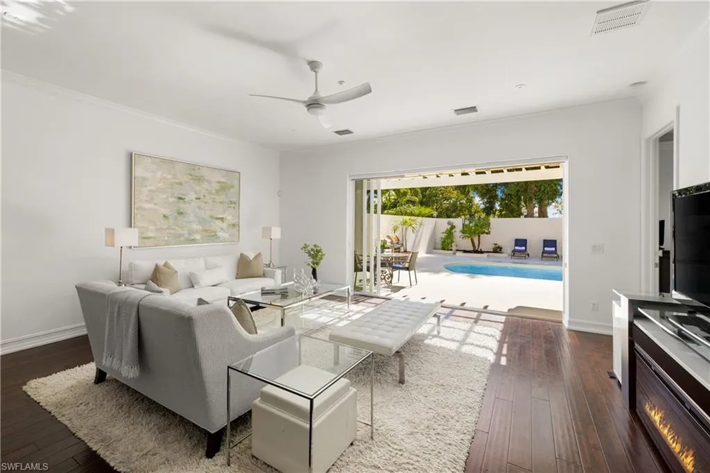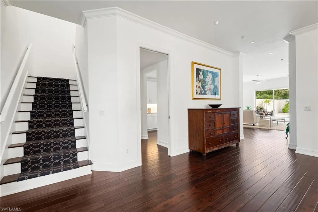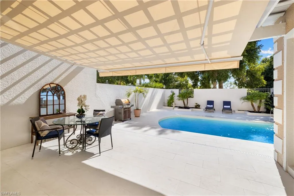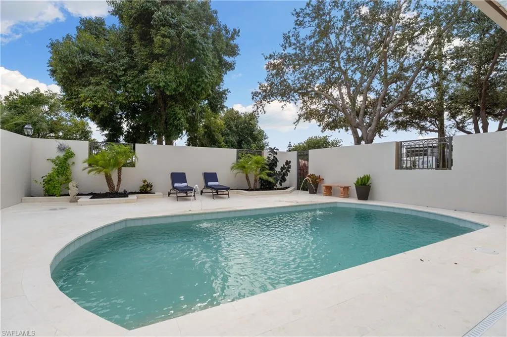 Experience refined Villa Pienza living in this elegant end-unit residence west of 41, where sun-drenched interiors, modern finishes, and the ease of maintenance-free living blend seamlessly in a home that lives like a private single-family retreat. Inside, natural light fills the spacious great room and flows into a bright modern kitchen appointed with an island, butler’s pantry with dry bar and wine fridge, and an inviting dining area ideal for both relaxed gatherings and elevated entertaining. Hardwood floors and timeless design elements create a warm, sophisticated ambiance throughout. The first-floor primary suite provides a peaceful sanctuary with ample closet space and a serene, spa-inspired bath. Upstairs, two generously sized guest bedrooms and a versatile den offer an ideal layout for visitors, work, or quiet leisure, while two private balconies welcome fresh breezes and soft Naples light. Outside, a private backyard oasis awaits—lush landscaping, a trellised lanai, awning, south-facing pool, and an open deck designed for sun-soaked afternoons and intimate evenings. Situated in the highly desirable west-of-41 corridor and within the X-500 flood zone, this pet-friendly villa combines the freedom of maintenance-free living with the comfort, privacy, and scale of a single-family home. Clam Pass and Seagate Beach are just moments away, while Waterside Shops, Venetian Village, and downtown Naples offer premier shopping and dining within easy reach.