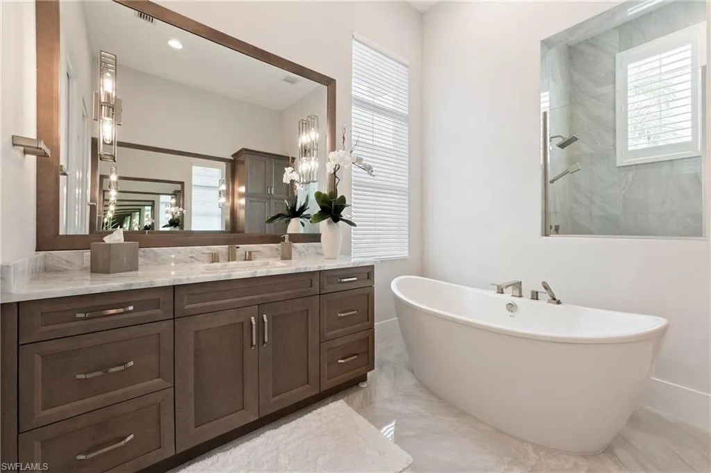 The BEST VALUE LUXURY home with THE MOST UPGRADES in award winning Isles of Collier Preserve! This magnificent FURNISHED saltwater POOL and SPA home with tranquil lake views is truly a showplace and will impress even the pickiest buyers. The location affords the most SPECTACULAR SUNSETS (please see photos). Built by famous STOCK builder, highly desirable Madison II floorplan. ENTERTAINER’S DREAM home with designer furniture (Valued at over $335,000!), designer window coverings and custom draperies, an open concept floor plan, tons of natural light, chef’s dream kitchen & LUXURY OUTDOOR LIVING. Soaring ceilings and light filled glass sliding doors for that airy feel. Large living room with custom built-in shelves and a stunning chandelier. Gourmet chef’s kitchen with lots of cabinets, custom upper glass cabinets, huge island, Jenn Air appliances including wine refrigerator, breakfast bar, a walk-in pantry, quartz countertops and backsplash and gourmet gas cooktop. Your divine and private master suite includes two walk-in closets with custom built-ins, a walk-in shower, elegant tub and dual sinks. Master bedroom is located on its own side of the home for extra privacy and walks out to the lanai, perfect for your morning coffee. Each guest bedroom has its private bathroom for your guest’s comfort. The amount of covered and uncovered outdoor space is unreal, allowing you to enjoy being outside all year round. Outdoor area will impress you with outdoor kitchen, fireplace, panoramic view lanai cage, cool water outdoor shower, saltwater pool with sun shelf, water features and spa overlooking peaceful lake. The lanai features a built-in bug repellent system and exterior roll-down storm shutters. 3-car airconditioned garage is complete with epoxy flooring, insulated garage doors with heavy-duty springs and storm surge protection. Large attic with tons of added lights is perfect for extra storage. This home is equipped with a powerful 32 kW generator, 1,000-gallon propane tank, and an energy management system. This majestic home with LUXURY UPGRADES GALORE and beautiful decor will sure impress you as soon as you will walk in through the front door. Feel like you are on vacation with resort style amenities in this lively extremely desirable community. Short walk to Cypress Waterway and beautiful NATURE TRAILS. Isles of Collier Preserve has it all! Lakeside dining at the Overlook Bar & Grill, 2 pools, even a dog park. You can stay in shape playing tennis, pickleball, bocce ball, swimming laps, working out in the fitness center, hiking and biking on 7+ miles of trails, paddle boarding, kayaking on the Cypress Waterway. If you are looking for a larger boating experience, The Isles adjoins Hamilton Harbor, a magnificent marina and club located right on Naples Bay! This exclusive community is only minutes away from historic downtown and gorgeous Naples beaches.