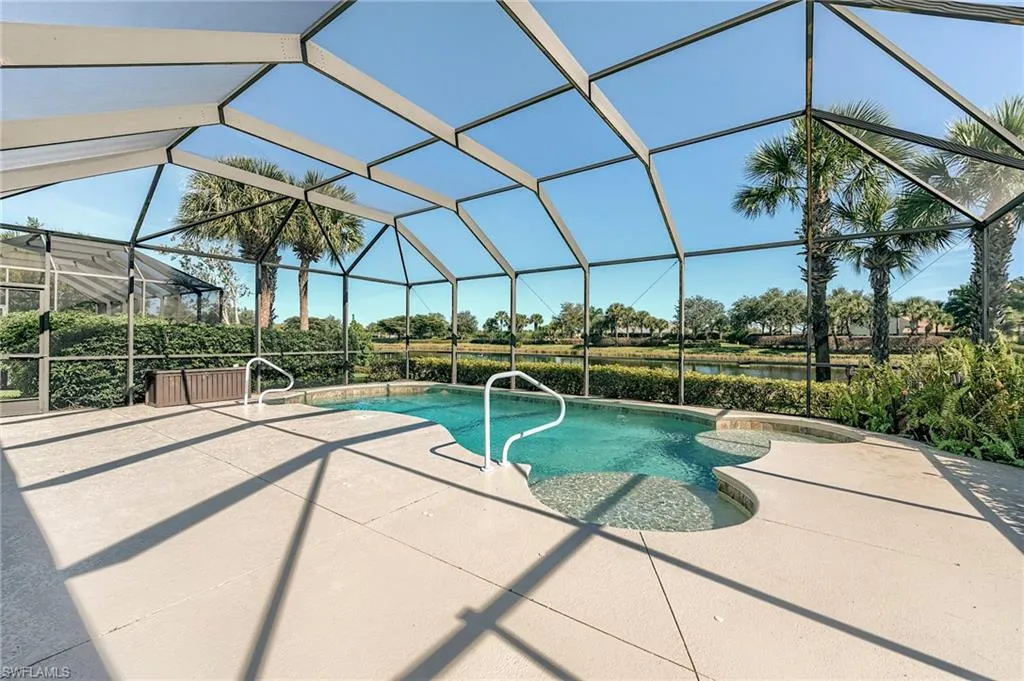 Have you ever dreamed of starting your day with a relaxing cup of coffee while watching a gorgeous Florida sunrise? Well here’s your chance to make that dream come true! This beautiful 3 bedroom, 3 full bathroom pool home with almost 2000 sq. ft. of living space offers eastern exposure and an extended lanai where you can kick back and soak in the view of your pool and the lake with the egrets, herons, ibis and wood storks that frequent our area. Other features include tile throughout the main living areas of the house and engineered wood flooring in the 3 bedrooms (2 of the bedrooms are en suite); a wet bar with wine fridge, sink and cabinets; remodeled kitchen with quartz counters, extended counter space, new LG stove and cooktop, large farmer’s sink and soft-close drawers with pull-outs; plantation shutters in the breakfast nook and metal hurricane shutters all around the house for secure storm protection. If you enjoy painting or crafting, this is the house for you! The 2 car garage is fitted with a Mitsubishi split air conditioning unit to keep you cool as well as an extractor fan for your painting, crafting and modeling projects. Located in the beautiful gated community of Verandah, buyers are eligible to join the Verandah Club where they can avail themselves of Verandah’s wonderful amenities including two championship 18-hole golf courses, 5 Har-Tru tennis courts, 8 pickleball courts, 2 bocce courts, resort style swimming pool, state of the art fitness center and two restaurants. Located in one of Fort Myers’ most desirable communities, this home is truly a must see! Make your appointment today!