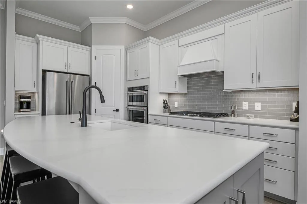 The kitchen offers upgraded cabinetry with soft close cabinets and pull-out drawers, soft touch “leathered” quartz countertops, an oversized island for gathering with friends, a well-sized pantry, a bright and airy kitchen cafe for casual meals, and abundant natural light throughout.