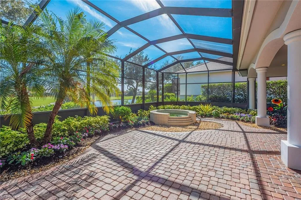 Rarely available, this Mulberry Row residence offers breathtaking views of the 15th fairway of the Rookery golf course and water, capturing peaceful eastern sunrises over the manicured golf course and lake. Thoughtfully designed for comfort and elegance, this 3-bedroom plus den, 2-full-bath home with a 2-car garage features low HOA fees, a 2018 roof, a CDD bond paid in full, and outstanding upgrades, including a Generac whole-house generator, gas tankless water heater, a security system, and two HVAC systems, with the main AC replaced in 2024. The screened lanai is a serene outdoor retreat, showcasing covered outdoor living, a gas-heated spa, recessed lighting, all overlooking the sweeping golf course and lake views. With storm shutters and timeless curb appeal, this home is ideal for those seeking both beauty and practicality, with the added flexibility to add a pool if desired. Inside, refined architectural details include diagonal 19” x 19” porcelain tile flooring, volume and tray ceilings, crown molding, arched walkways, recessed lighting, and white plantation shutters throughout. The open kitchen is designed for both functionality and style, featuring white cabinetry, white quartz counters, a pass-through window to the lanai, under-cabinet and above-cabinet lighting, and stainless appliances, including a newer refrigerator with icemaker, wall oven, microwave, dishwasher, and an elite 4-burner induction cooktop with a newer hood. Additional kitchen upgrades include a Blanco Solon in-counter compost system, enhancing convenience and sustainability. Adjacent to the kitchen, the formal dining area features a built-in wall cabinet with a granite top and an arched transom window. The bright breakfast nook overlooks the lanai and opens through French doors to the covered outdoor living space. The inviting living room offers a tray ceiling, built-in entertainment center with wine shelving and a wine cooler, and sliding glass doors that seamlessly extend the living space outdoors. The owner’s suite is a peaceful sanctuary with French doors to the lanai, tray ceiling, and his-and-her walk-in closets, including built-in wood shelving and custom built-in drawers in her closet. The luxurious bath offers a dual-sink vanity, jetted soaking tub, and a walk-in shower tiled floor-to-ceiling with a privacy window. Two guest bedrooms share a full bath with dual sinks and a walk-in shower with glass enclosure; one of the guest rooms also features Hunter Douglas blinds and direct lanai access. The den, ideal for an office or media room, is enhanced with in-ceiling speakers. A laundry room with a newer Whirlpool washer and dryer, utility sink, and overhead cabinetry completes the interior. The garage features a painted floor, fluorescent lighting, a storage closet, and space for two cars. Enjoy the fantastic extensive Fiddler’s Creek amenities and lush landscaping, and the option to build your own brand-new pool. Seller has transferable flood insurance!