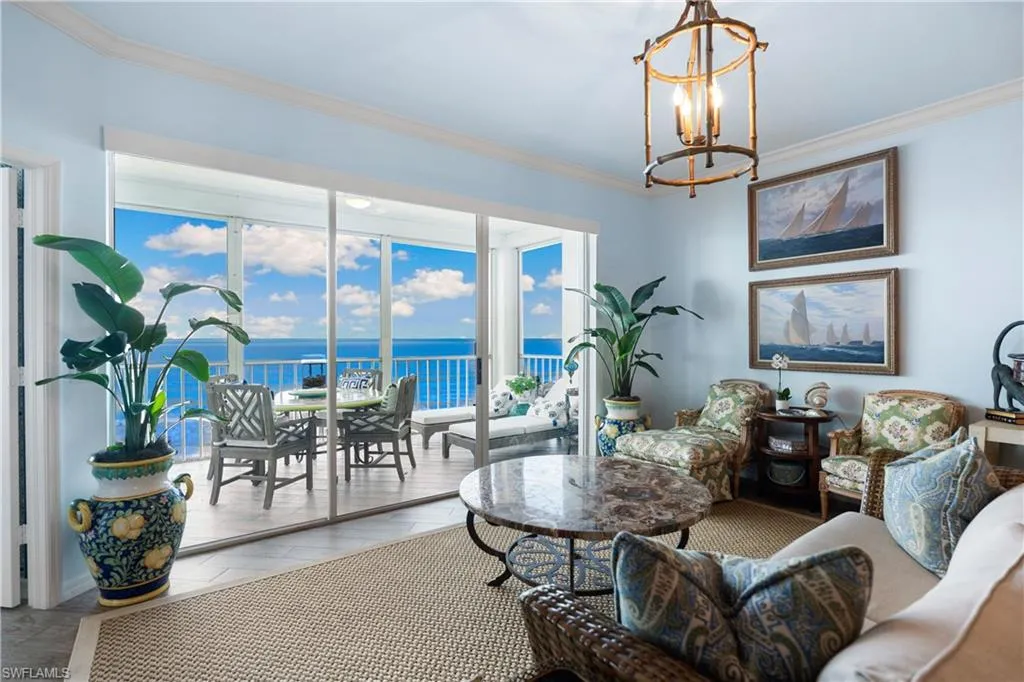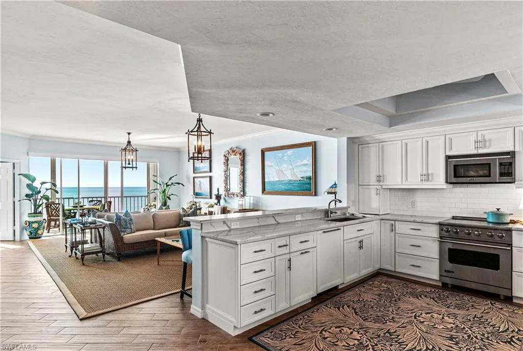 BEAUTIFULLY RENOVATED DIRECT BEACHFRONT CONDO in North Naples’ highly sought-after Barefoot Beach Club. Enjoy front-row, panoramic Gulf views from your private coastal retreat. This 2-bedroom plus den, 2-bath residence offers over 1,600 sq. ft. under air, featuring hurricane-impact windows, electric storm shutters, and stunning wood-look tile flooring throughout. This spacious floor plan includes versatile bonus nooks off each bedroom—perfect for a den, office, or nursery. The chef’s kitchen boasts quartz countertops, crisp white cabinetry, high-end appliances, a charming eat-in area, and a spacious breakfast bar—ideal for casual dining or entertaining. The open-concept living room features custom built-in shelving and entertainment center, all framing breathtaking views of the Gulf. Step out onto the spacious screened lanai to relax and unwind while enjoying endless sunsets over the water. The primary suite is a true sanctuary with private lanai access and a spa-like ensuite bath offering dual vanities and a glass-enclosed shower with multiple showerheads. Conveniently located near the brand-new clubhouse, featuring a resort-style pool with an outdoor kitchen, barbecue area, and entertainment space adjacent to the party rooms. The second floor offers a state-of-the-art fitness center and borrowing library, while the third floor includes a spacious kitchen, expansive entertaining balcony, and large event area perfect for gatherings and celebrations. Barefoot Beach residents enjoy 3 miles of beach, 2 pools/spas, manned/gated entry & on-site mgmt. OPTIONAL “Club at Barefoot” offers tennis, 2 restaurants & beachside food/bev/chair service. Excellent Collier County location minutes to Mercato, Waterside & easy access to RSW Airport.