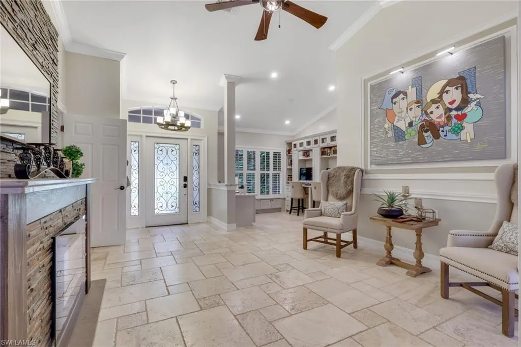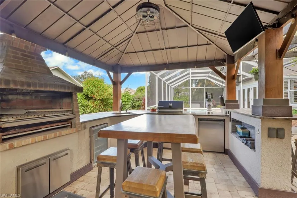 Beautifully Renovated Single-Family Pool Home in one of the most desirable neighborhoods – Palm River Estates in North Naples. X-FLOOD ZONE & NO HOA FEES! This is a perfect home for entertaining, inside and out! The exterior of the home has a new roof 2021, impact rated garage door, a new pool pump and provides for natural light and true Florida living with the french doors leading out to your own backyard oasis with gazebo and built in kitchen/bar area. The interior offers a split floorplan 3 Bedroom + Den/Office/3 Bathroom layout, featuring stunning Travertine flooring, updated bathrooms a built-out bar area off the formal dining room and custom built-in cabinetry throughout the home. You will look forward to pure relaxation each evening enjoying the Gulf Coast’s stunning sunsets.