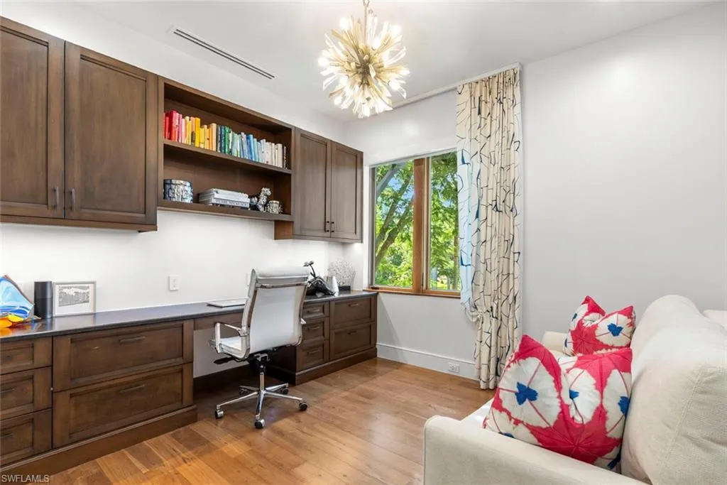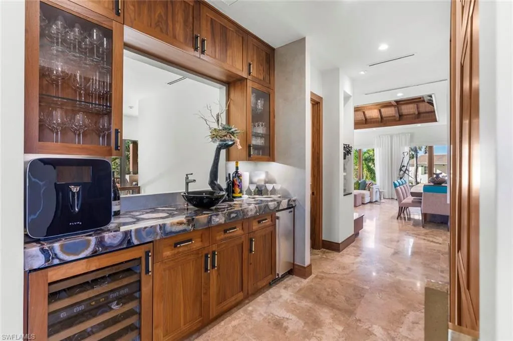 The gourmet kitchen adorned with Cristallo Quartzite serves as the heart of the home, with beautiful hardwoods that are increasingly rare, and surrounded by spectacular greenery that creates a sense of privacy and retreat. A custom quartz and agate wet bar opens to the elegant great room, where walls of glass frame western facing terraces. The primary suite offers an elevated sense of serenity with a private balcony with partial gulf views.